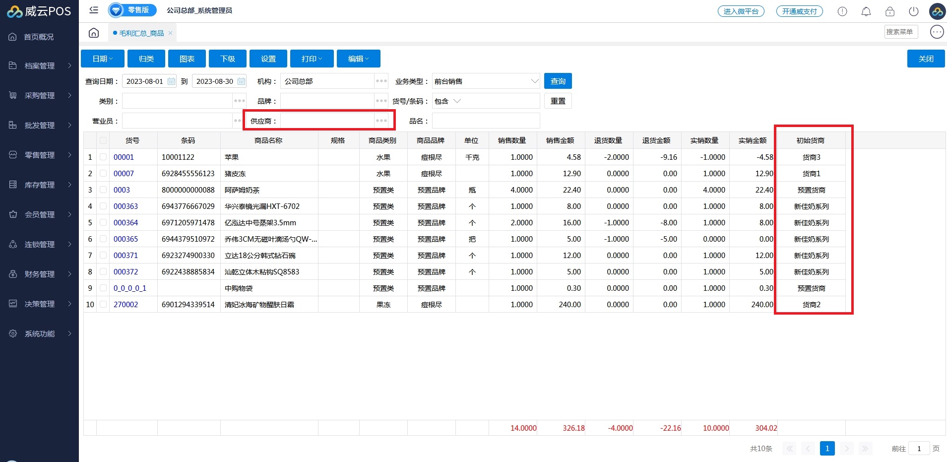 09. 威云后臺(tái)毛利匯總-商品報(bào)表增加了按初始貨商篩選條件的功能