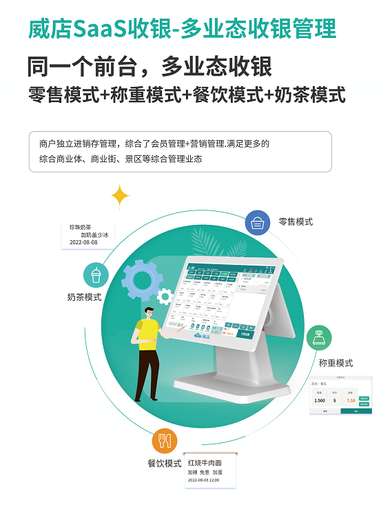 智百威威店零售SaaS系統(tǒng),開箱即用,支持同一個前臺多業(yè)態(tài)收銀,同時兼容零售模式、稱重模式、餐飲模式、奶茶模式收銀及無人值守模式。