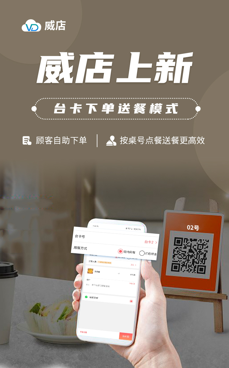 威店臺卡下單送餐模式,一般用于快餐店、米粉店等,顧客落座后,掃桌臺碼下單,等待商家送餐到桌。