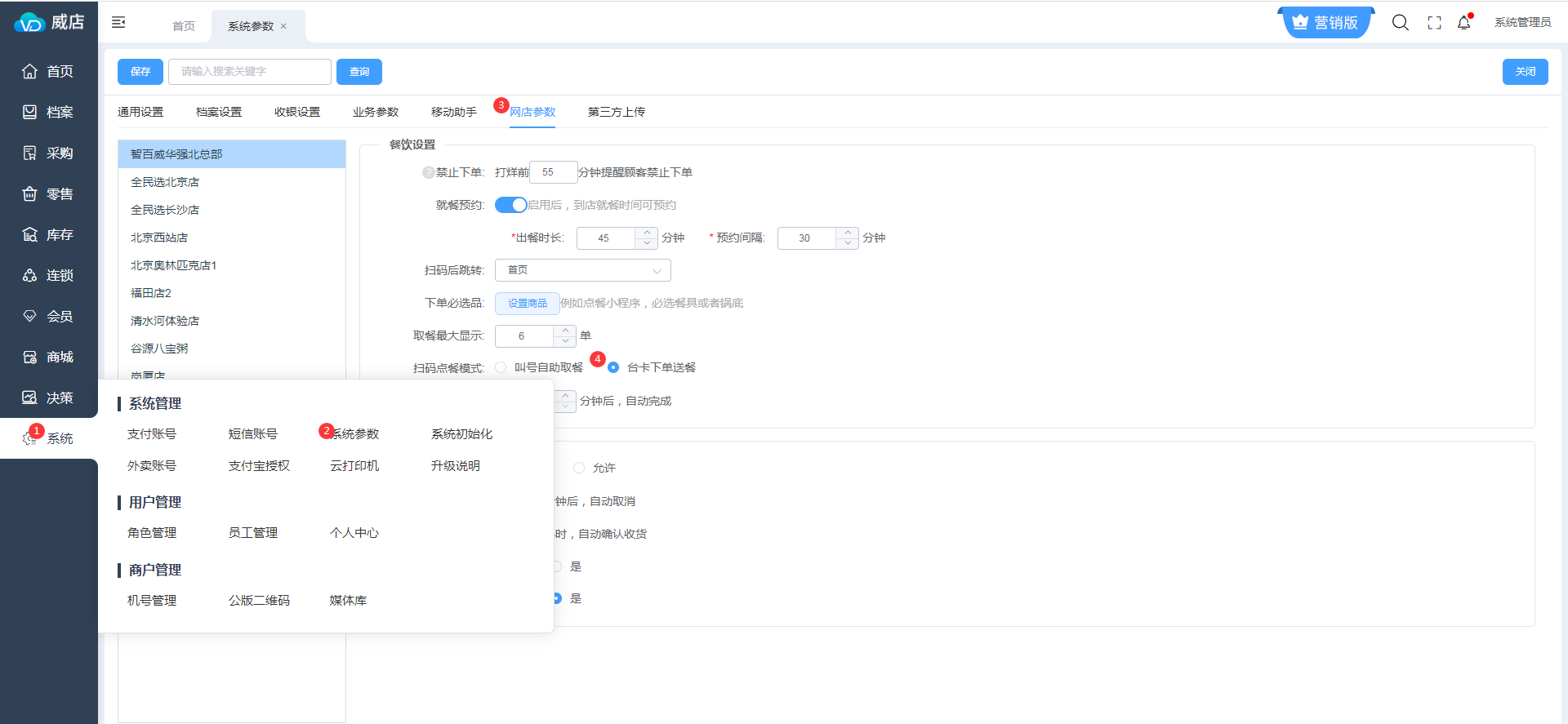 1)開啟參數(shù)系統(tǒng)/系統(tǒng)參數(shù)/網(wǎng)店參數(shù):掃碼點(diǎn)餐模式 選擇 臺卡下單送餐