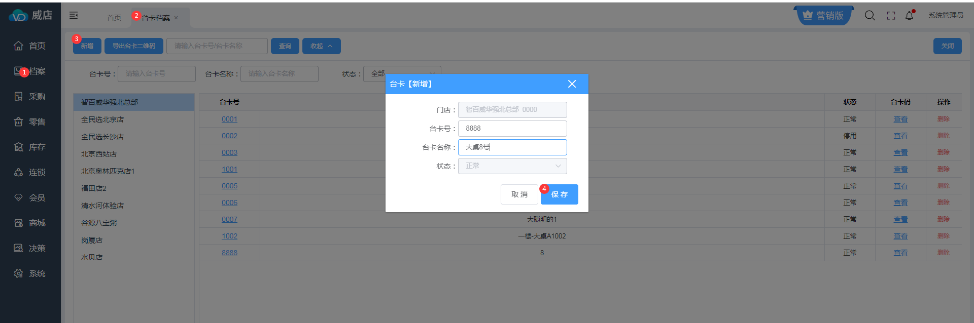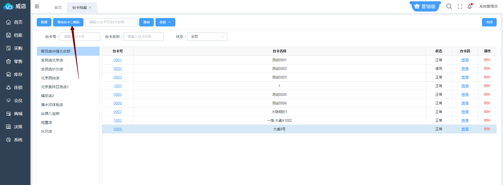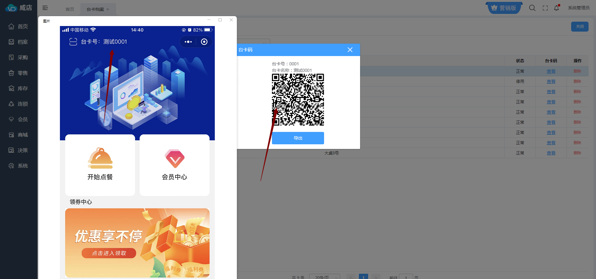 新增完臺卡后,點(diǎn)【導(dǎo)出臺卡二維碼】,把二維碼張貼在桌臺上