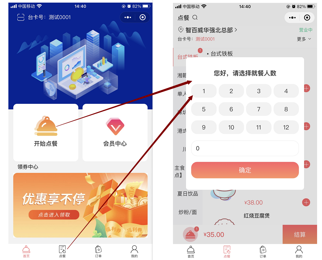 點(diǎn) “開始點(diǎn)餐” 或 “點(diǎn)餐” ,跳轉(zhuǎn)到 點(diǎn)餐模塊 ,并彈出 就餐人數(shù)選擇