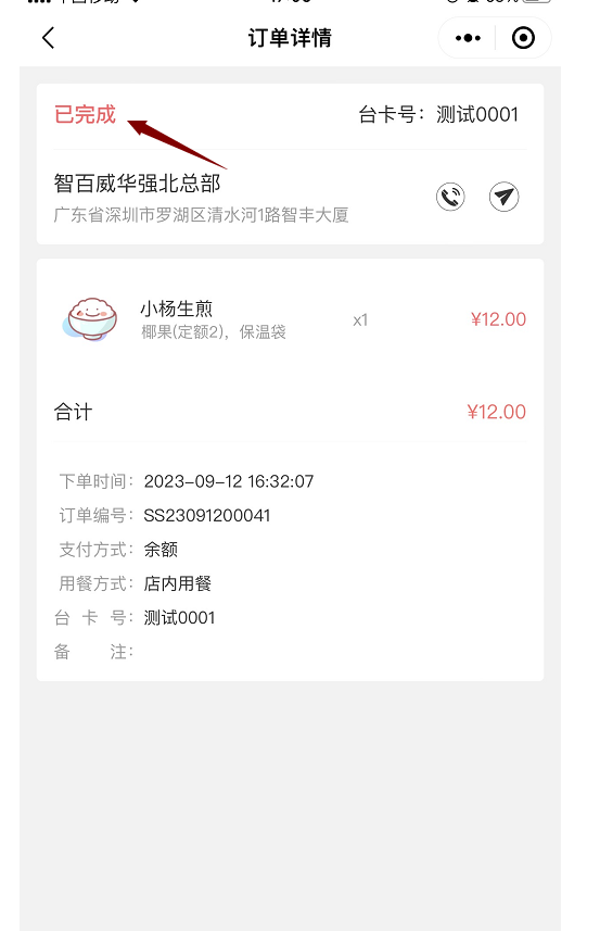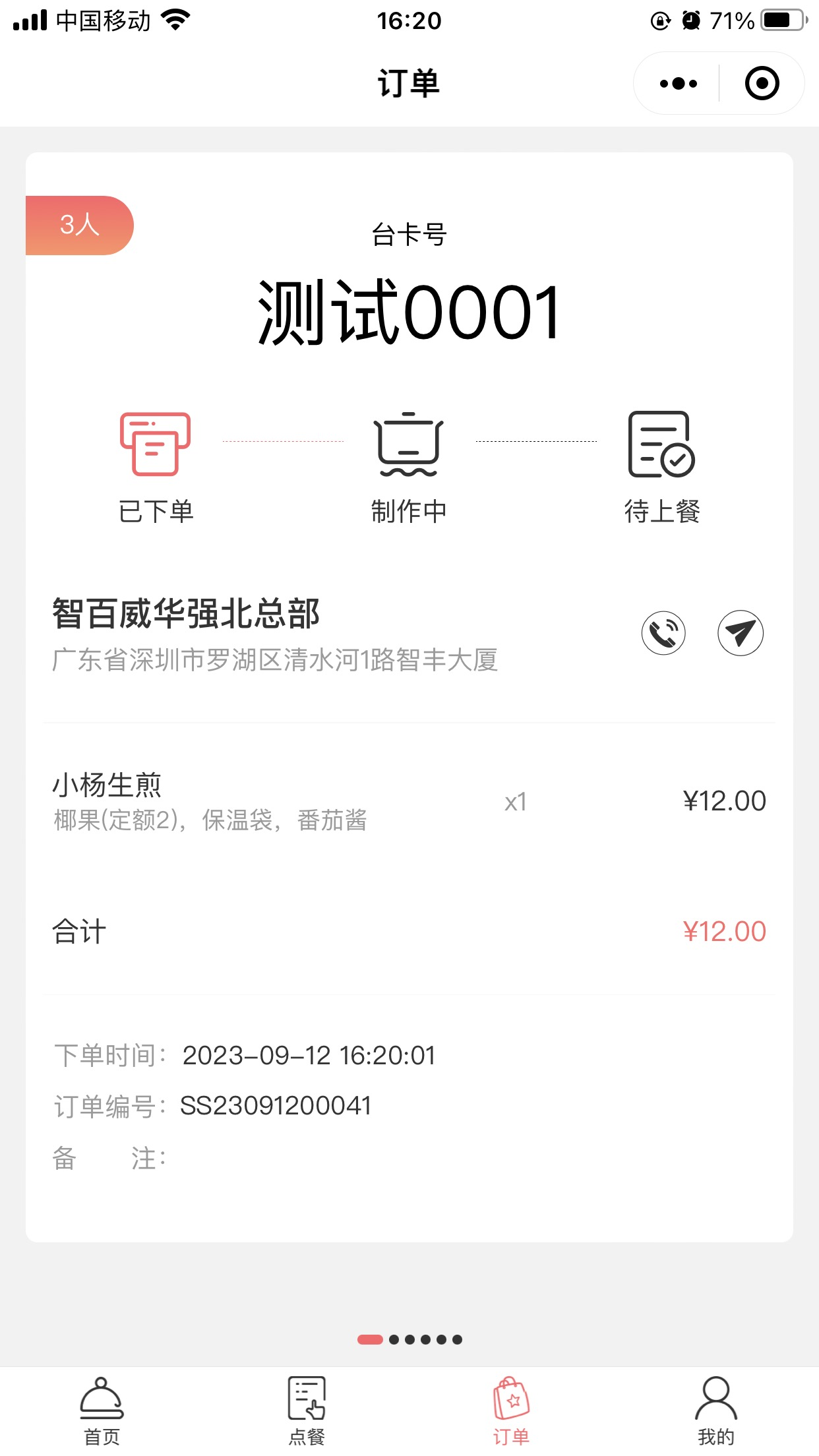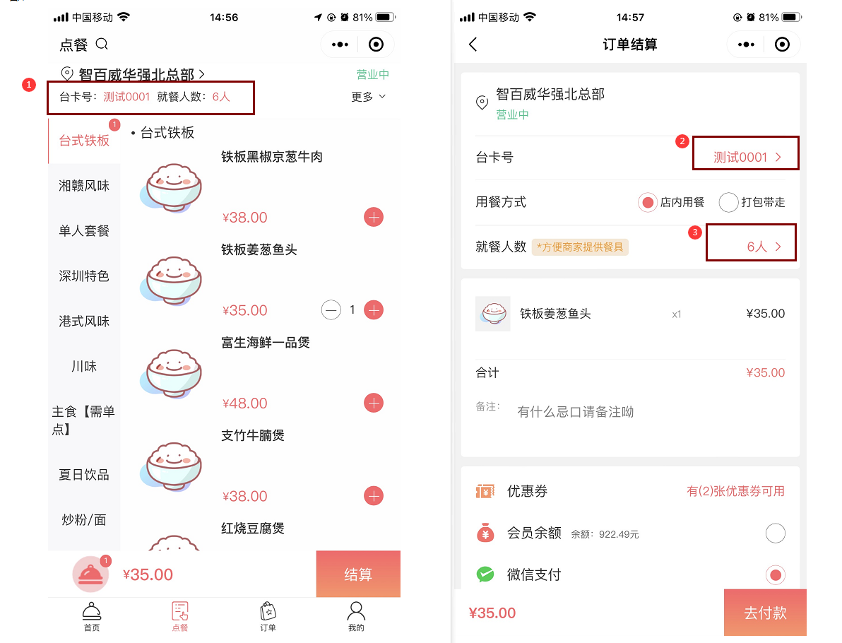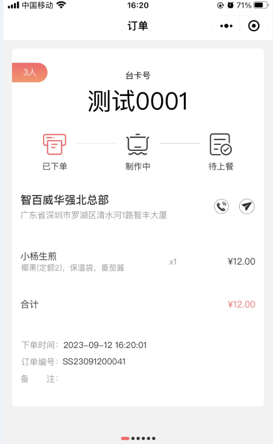 下單完成后,在訂單界面,左上角顯示人數(shù),中間顯示臺卡名稱
