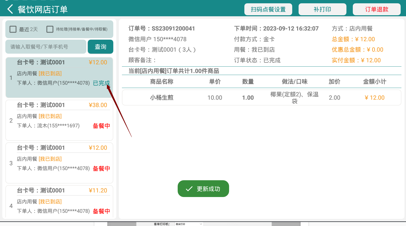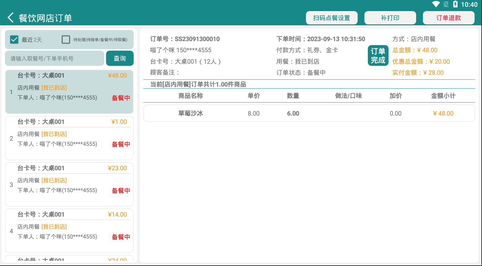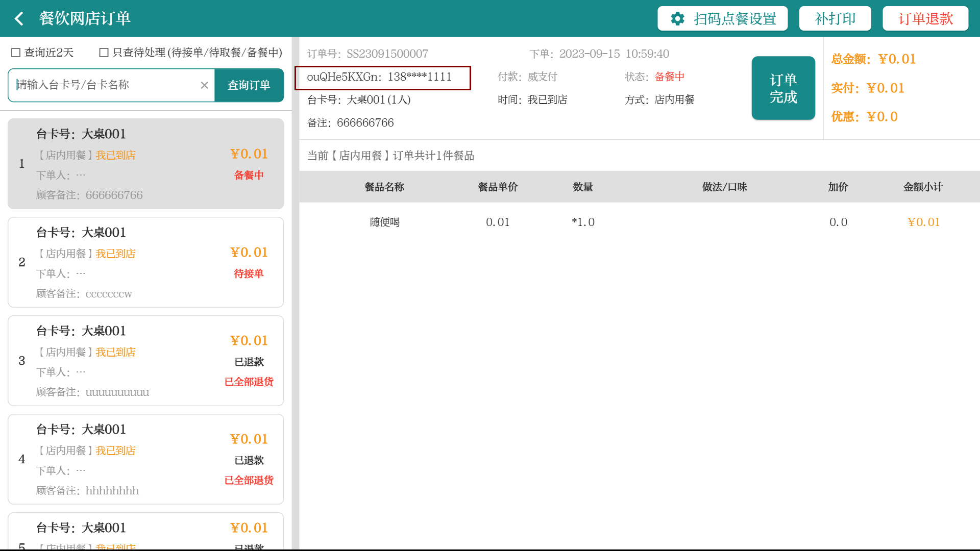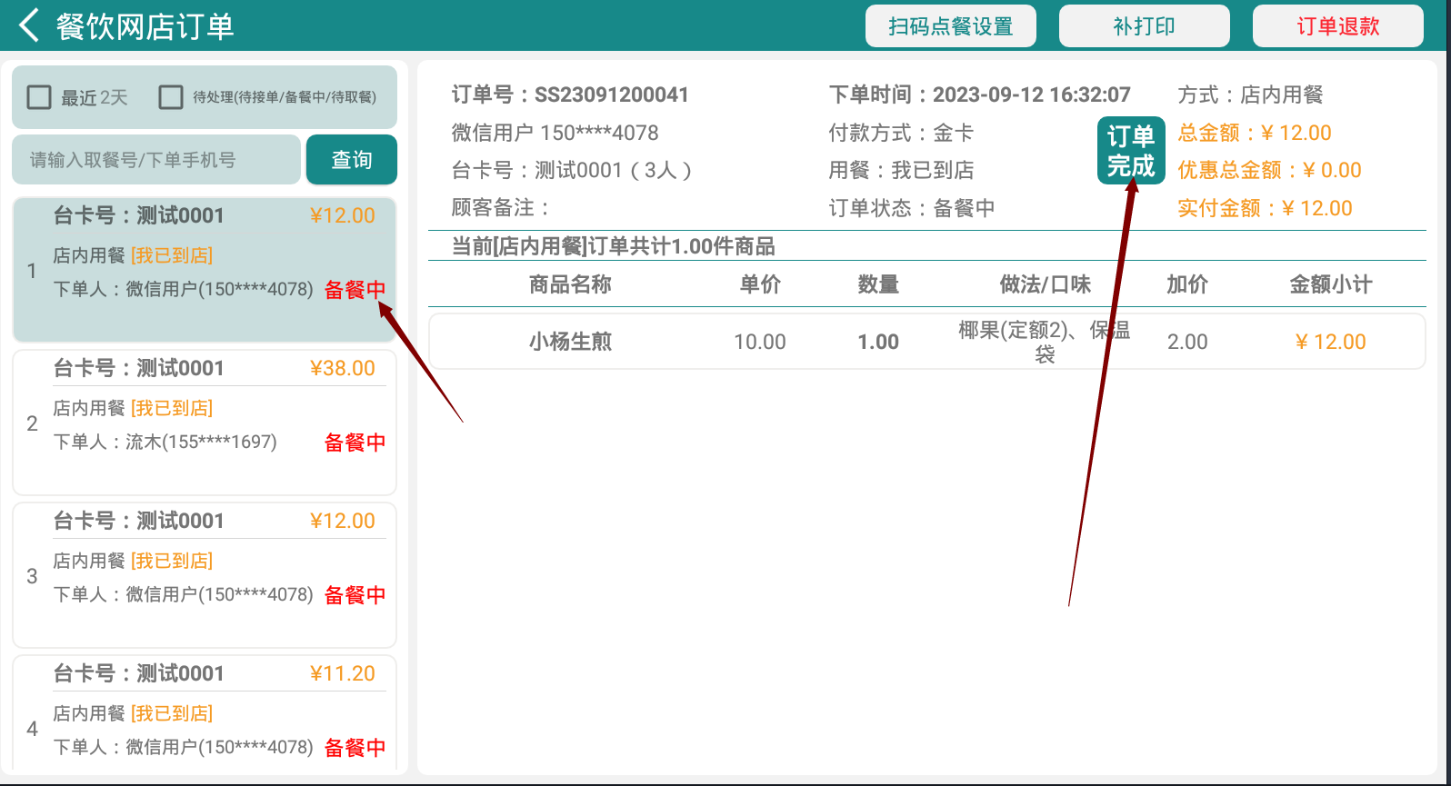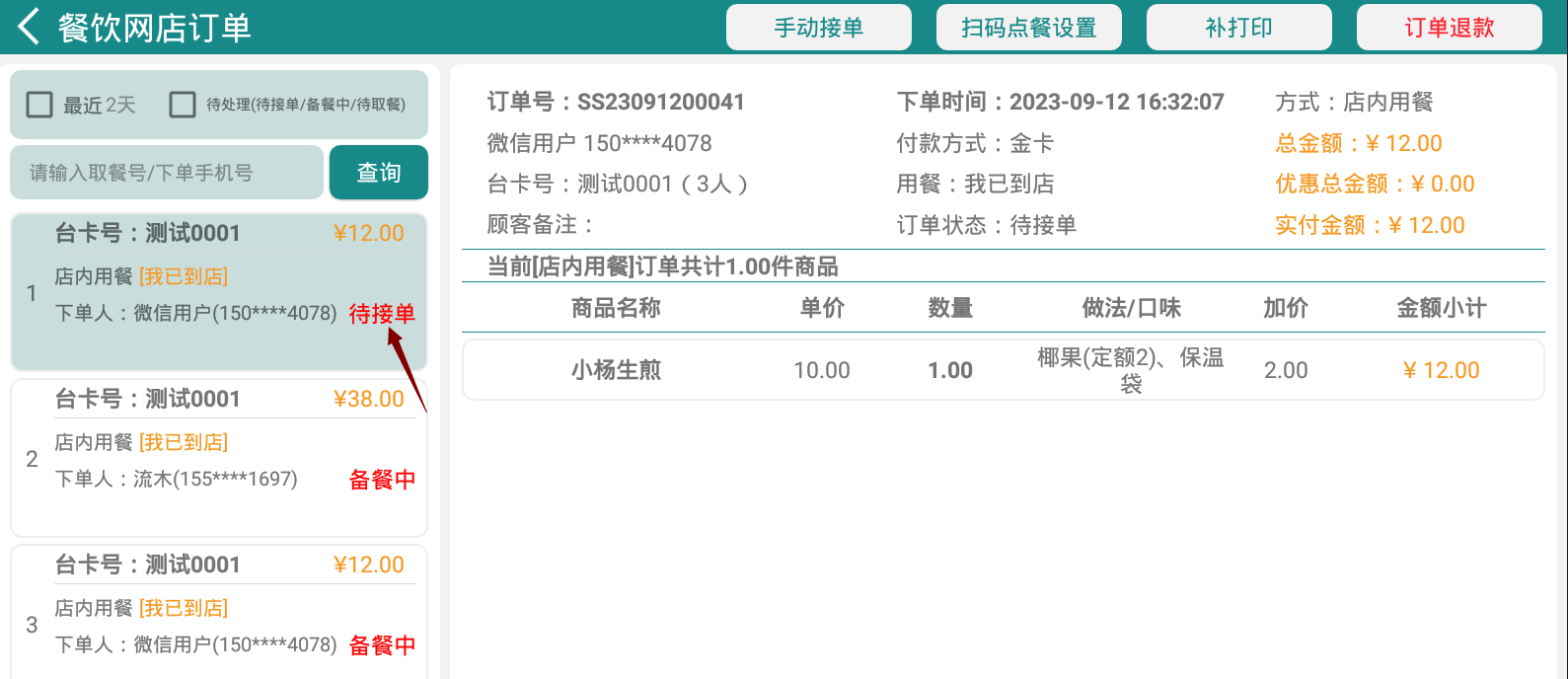 ③ 點(diǎn)【手動接單】,狀態(tài)更新為:備餐中,右邊顯示【訂單完成】按鈕,并打印廚打小票、客單小票、標(biāo)簽小票