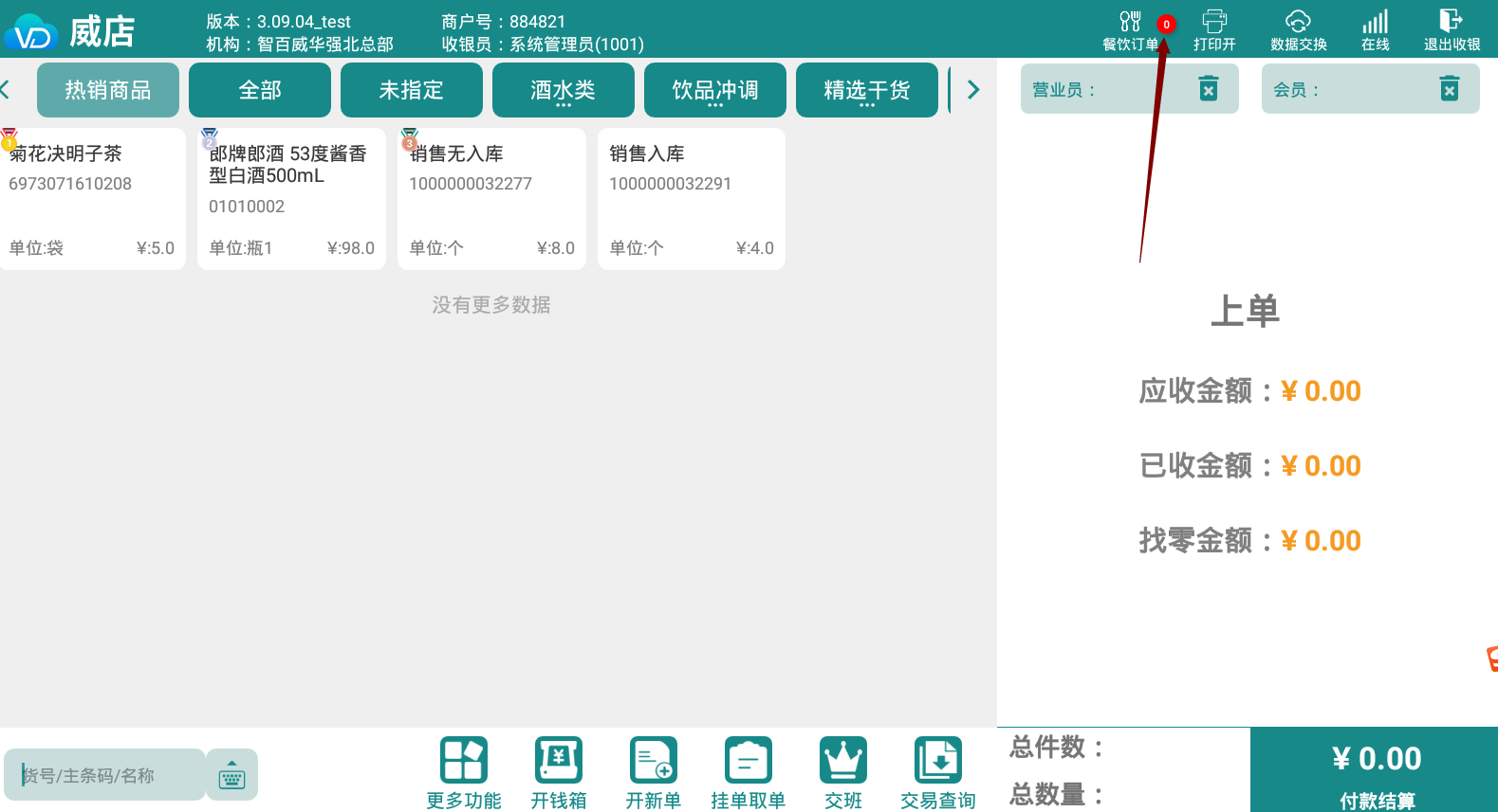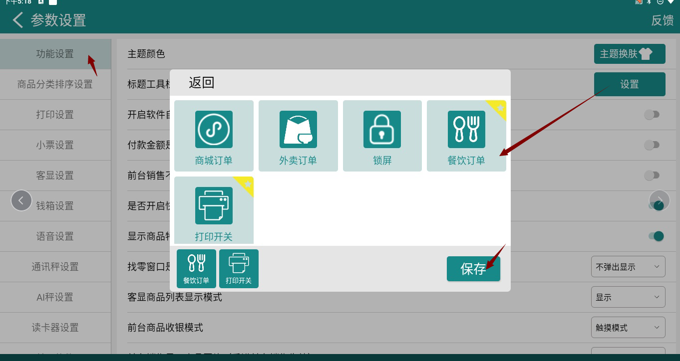 更多功能-系統(tǒng)設(shè)置-功能設(shè)置:標(biāo)題工具欄設(shè)置,勾上 餐飲訂單 ,保存