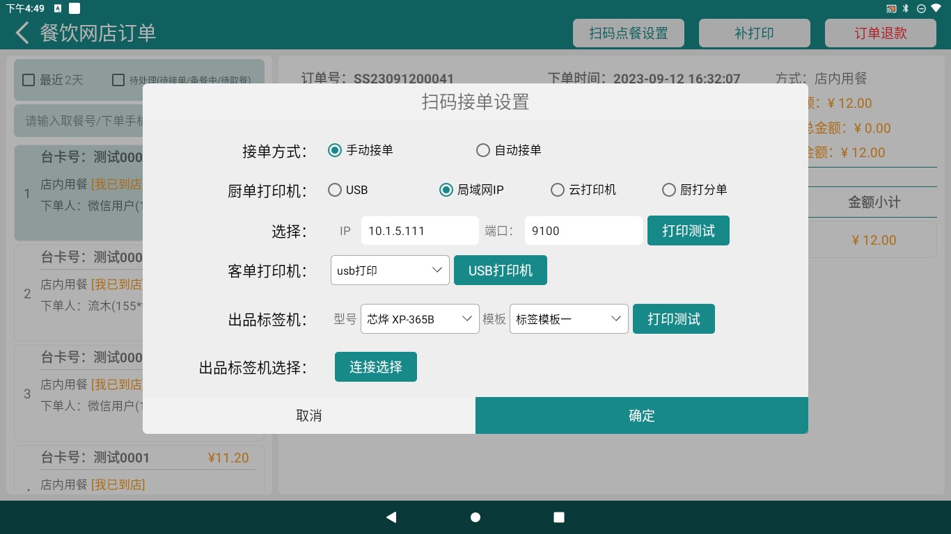 ① 選擇接單方式,指定廚打打印機(jī)、客單打印機(jī)、出品標(biāo)簽機(jī)