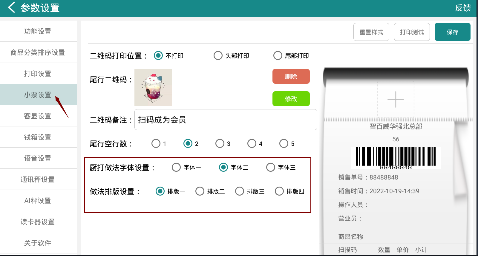 ② 廚打小票字體設(shè)置:更多功能-系統(tǒng)設(shè)置-小票設(shè)置
