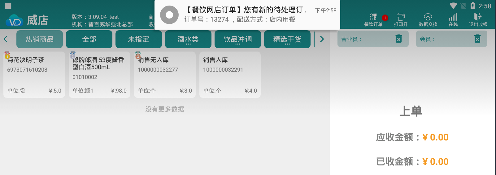 ② 安卓收銀臺語音播報(bào):您有新的餐飲網(wǎng)店訂單 和 通知,接收到新訂單,狀態(tài):待接單