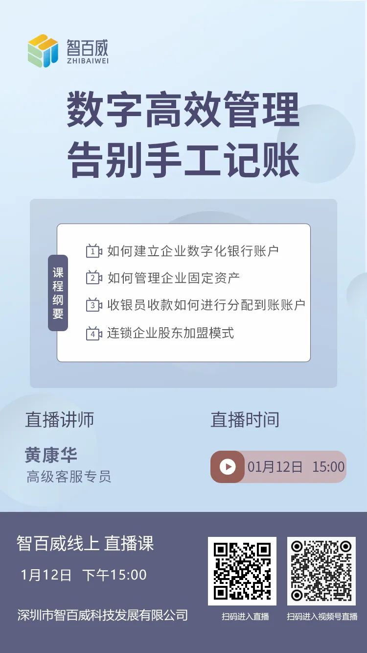 1月12日下午3點(diǎn),來(lái)智百威直播間,教您如何數(shù)字高效管理,建議企業(yè)數(shù)字化銀行賬戶、管理固定資產(chǎn)!