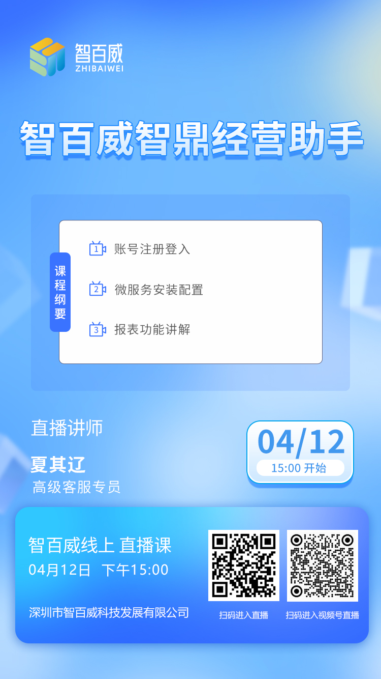 4月12日下午15:00,智百威直播間將深度講解,如何運(yùn)用智百威智鼎經(jīng)營助手提升運(yùn)營能力,期待您的參與哦~