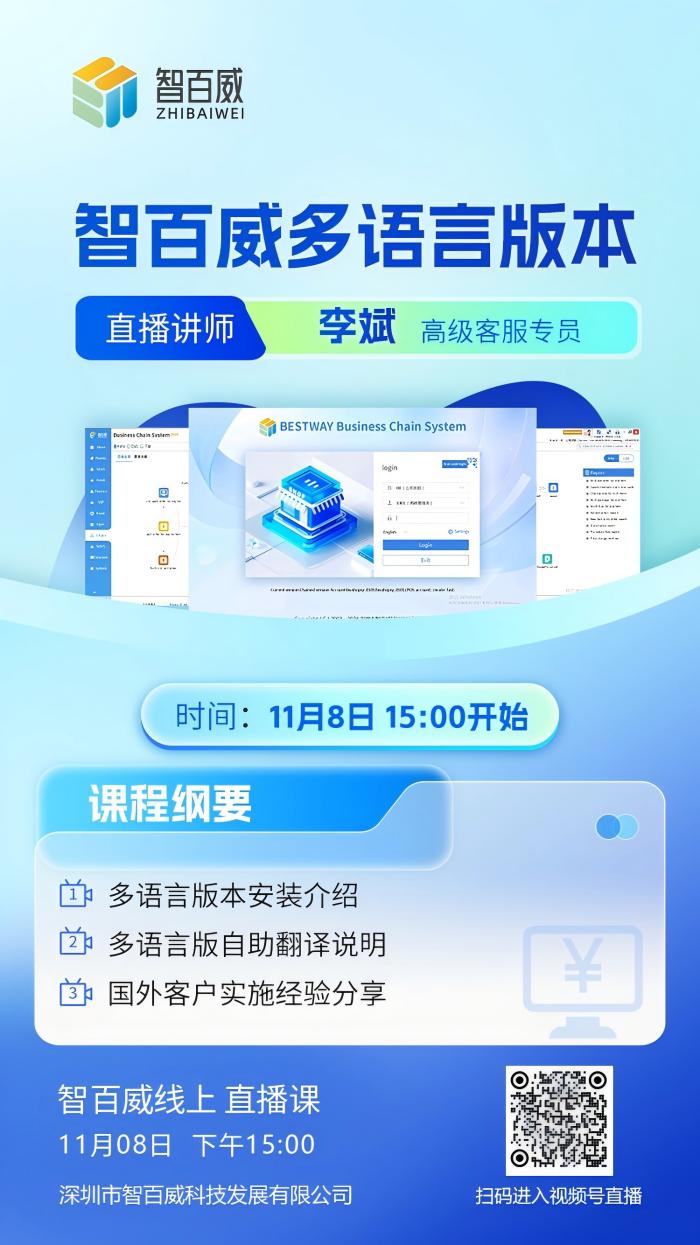 11月8日下午15:00,智百威直播間將在線(xiàn)上向大家深度講解智百威多語(yǔ)言版本,歡迎大家來(lái)到直播間交流,一直進(jìn)軍海外市場(chǎng)!