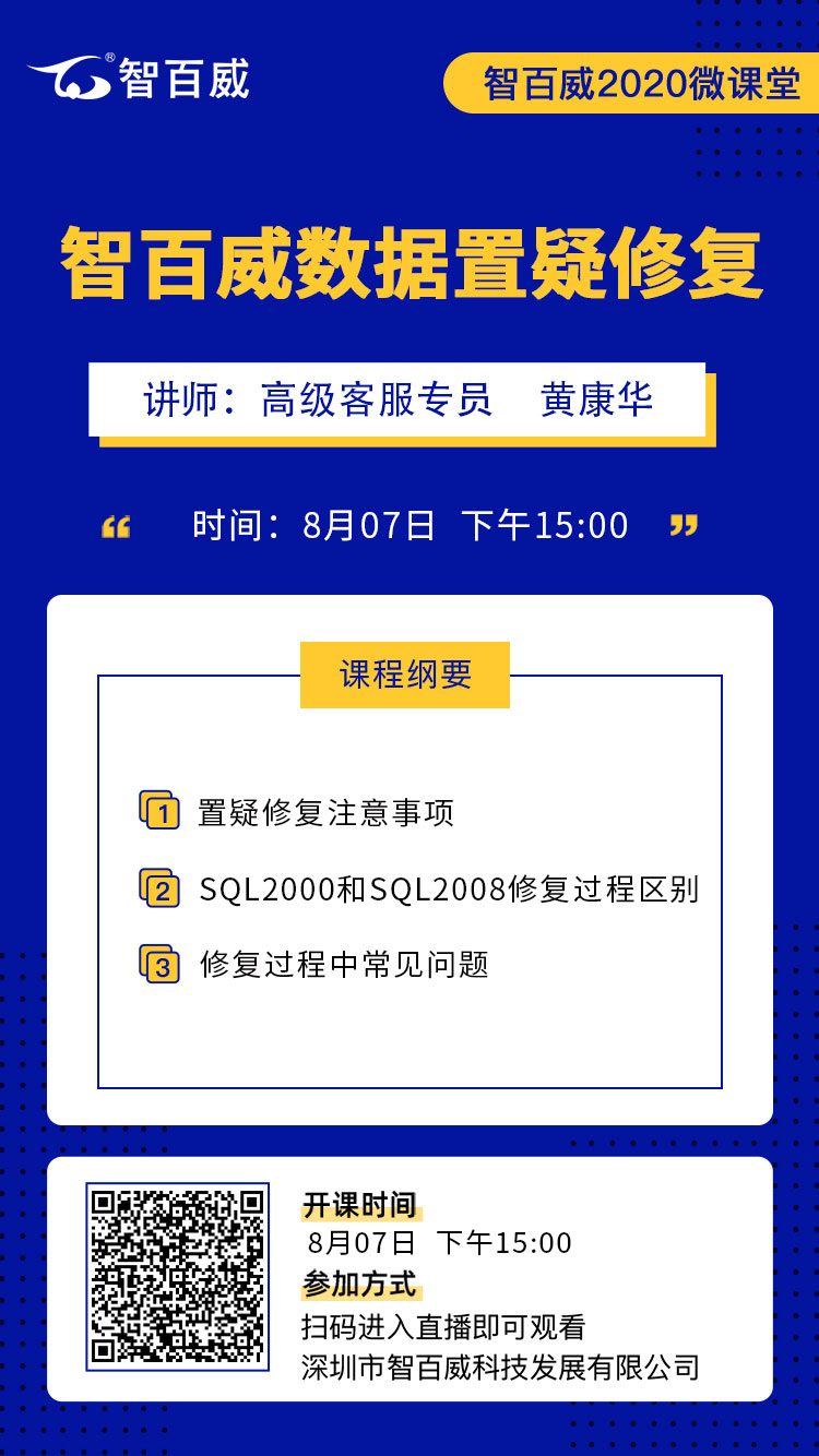 請鎖定8月7號下午3點由智百威高級客服專員直播為你實操演練修復(fù)數(shù)據(jù)置疑的方法。
