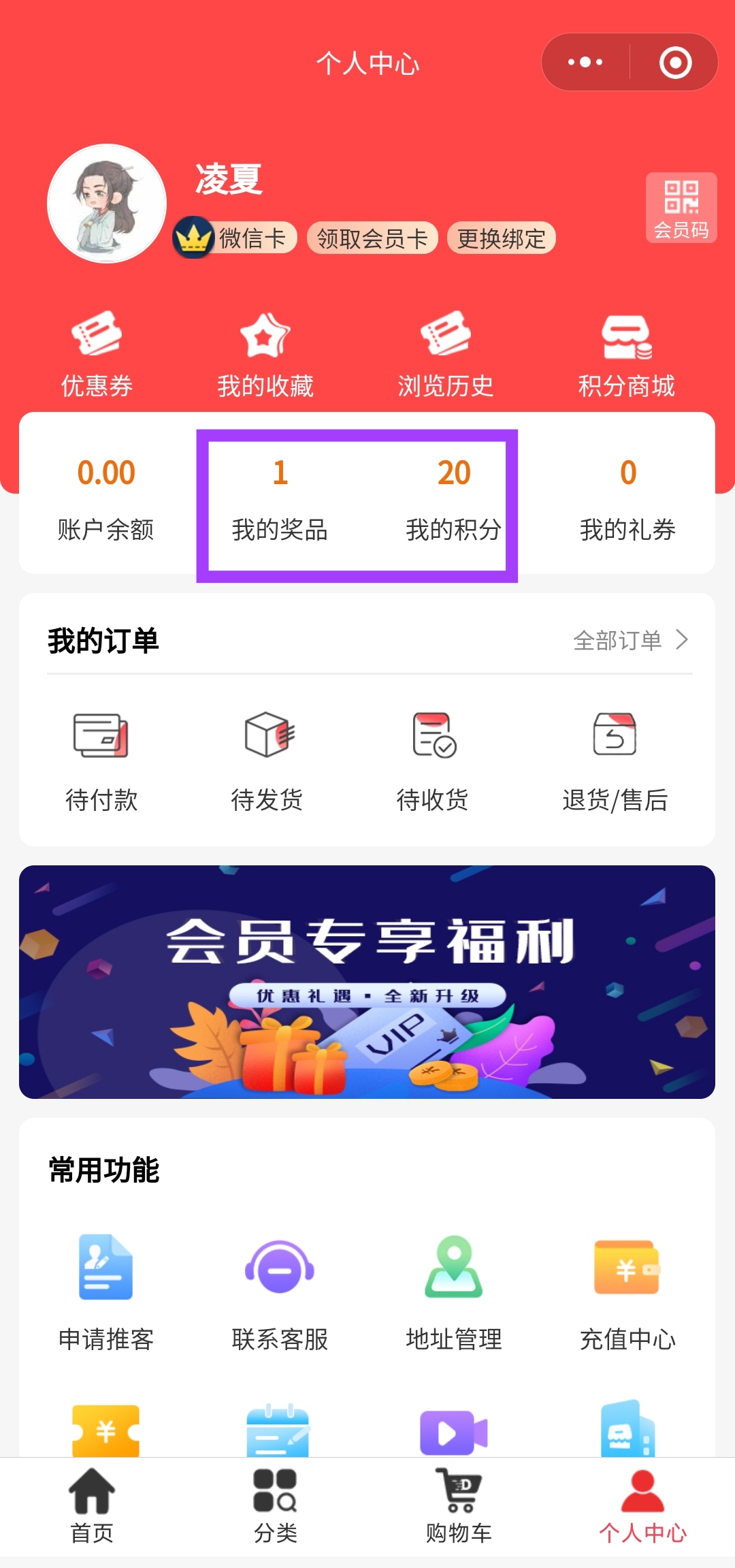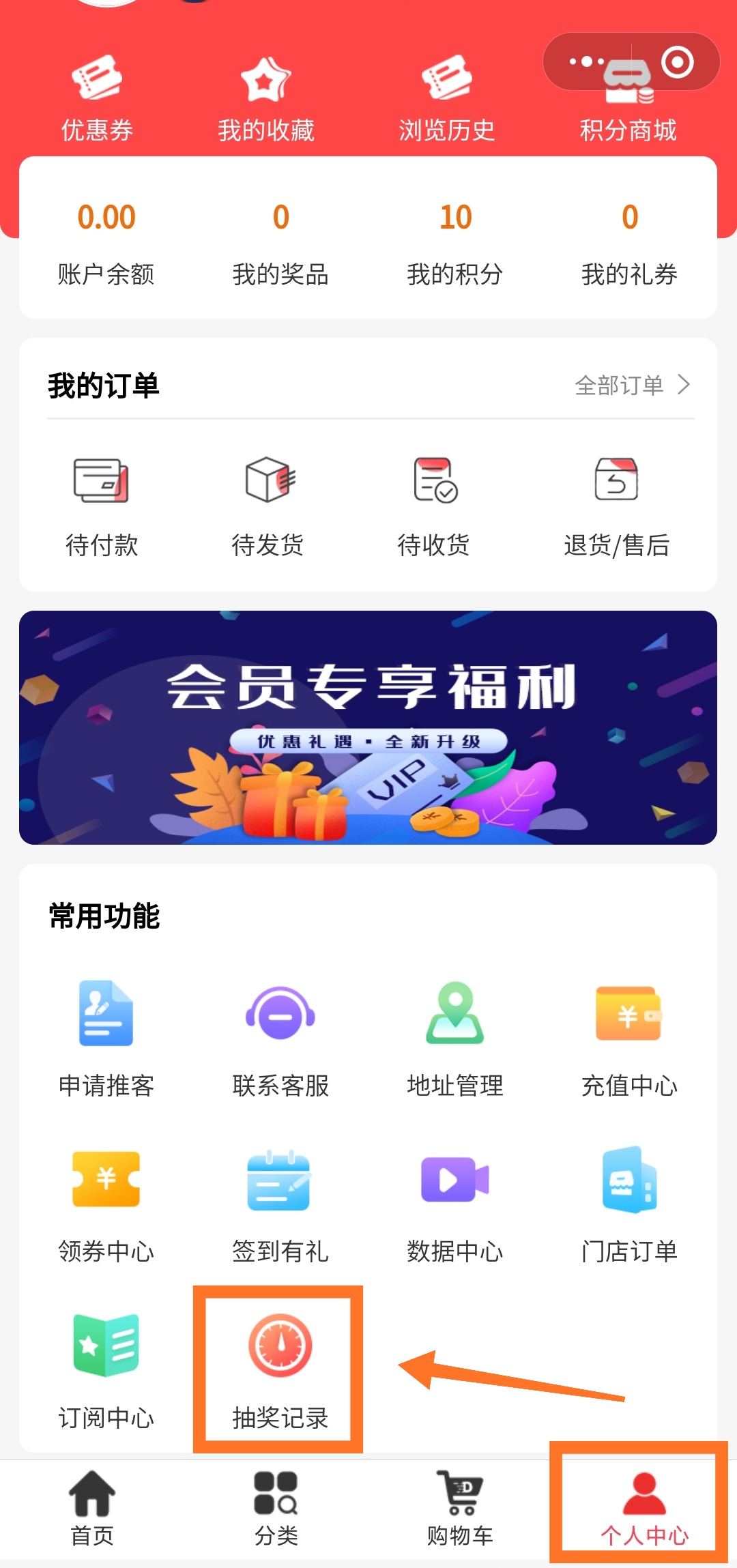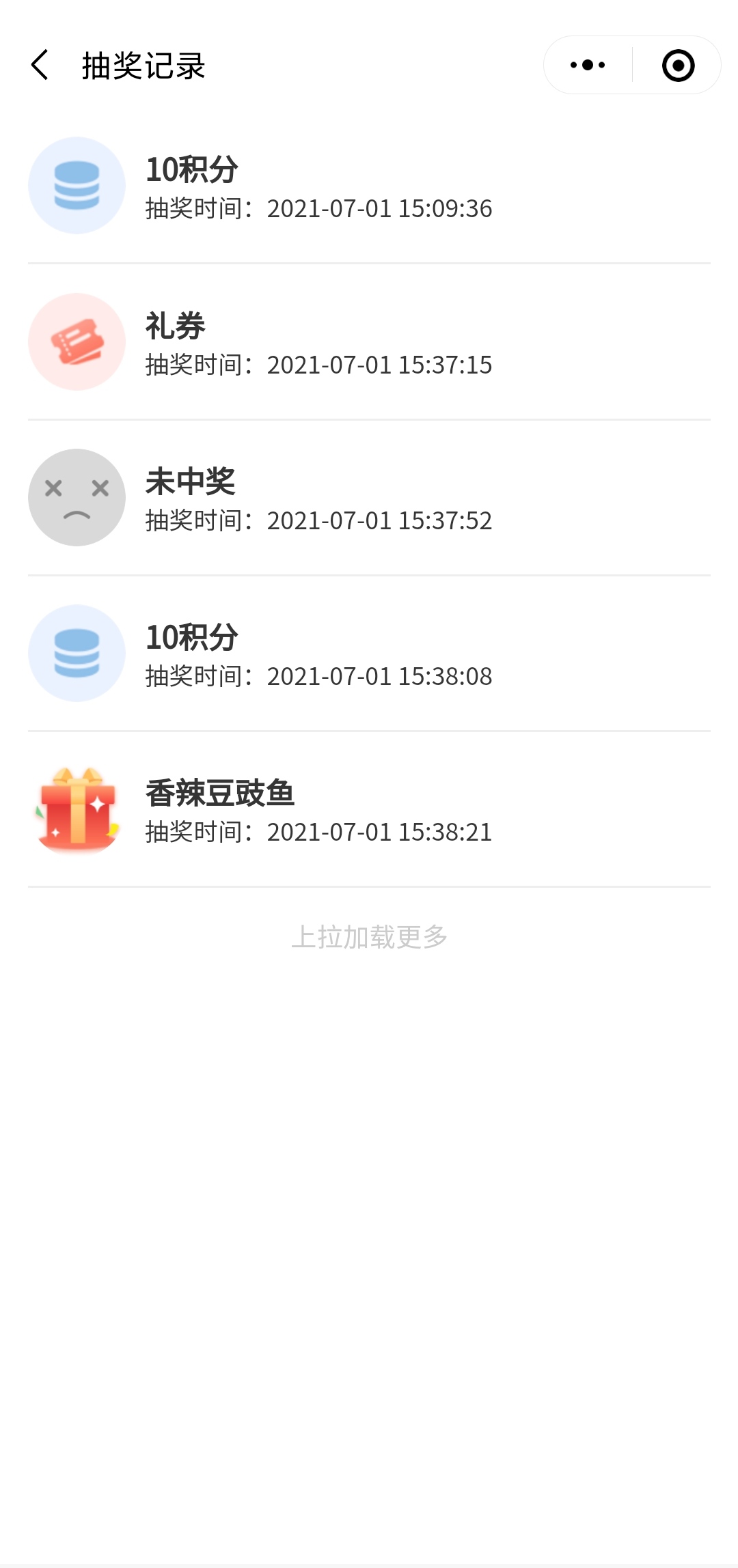 顧客中獎后在顧客端“個人中心”自動累計獎勵/積分,在“抽獎記錄”里可查詢抽獎流水