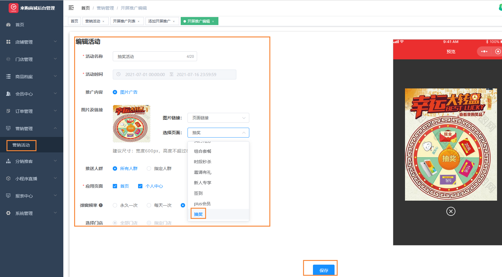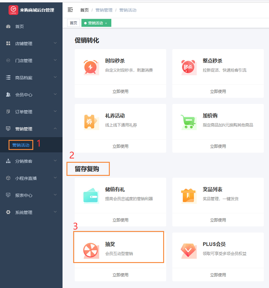 用戶登錄來購商戶后臺,打開“營銷管理”--展開“營銷活動”模塊--下滑到“留存復購”--打開“抽獎”功能