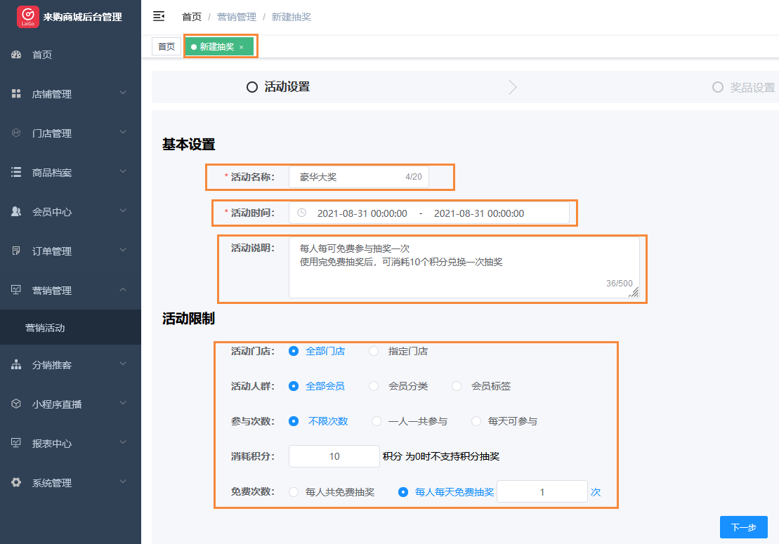 打開抽獎功能后點擊”新建抽獎”根據(jù)指引填寫抽獎活動的基本信息,如抽獎名稱,參與門店等