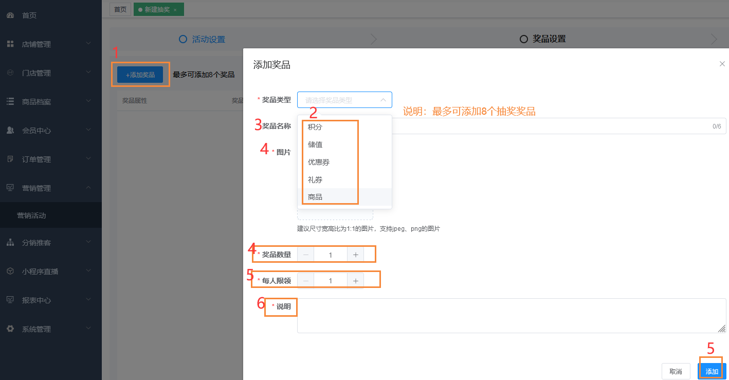 填寫好后點“下一步”添加獎品,根據(jù)指引添加,最多可添加8個獎品