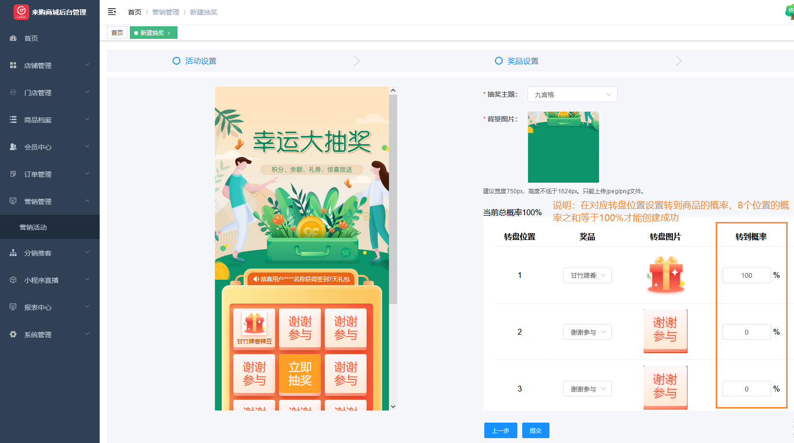 添加完獎品后,點下一步設置中獎機率,8個獎品的中獎概率總和要等于100%才能創(chuàng)建活動成功