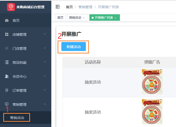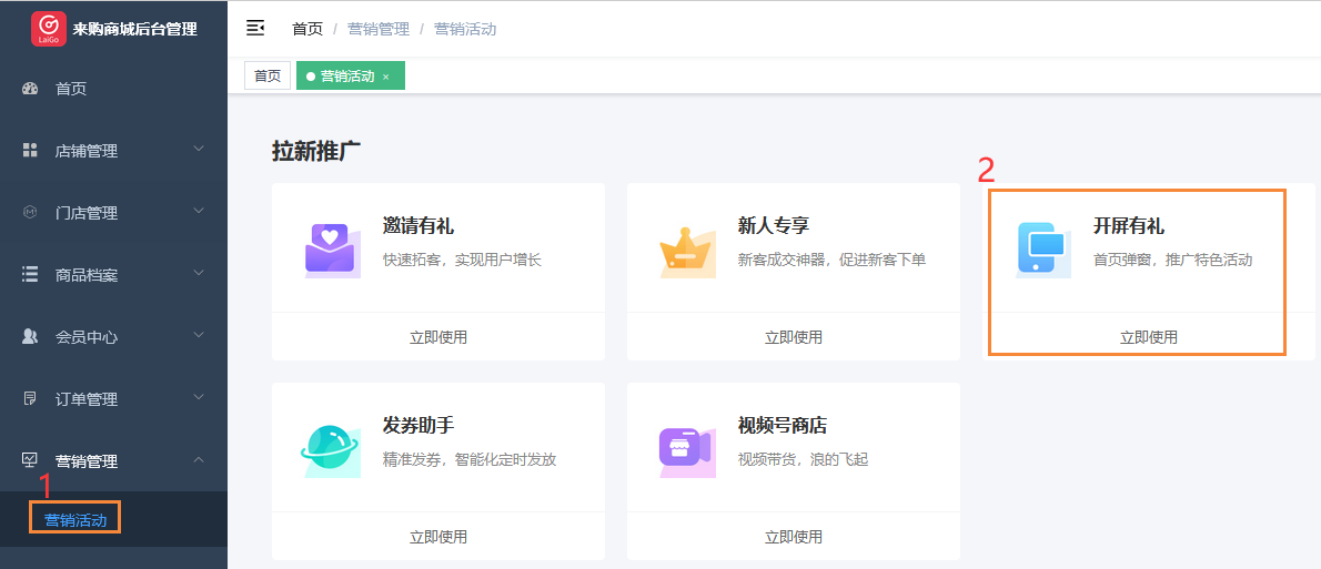 用戶進入來購商戶后臺,點開“營銷活動”--點擊“開屏有禮”