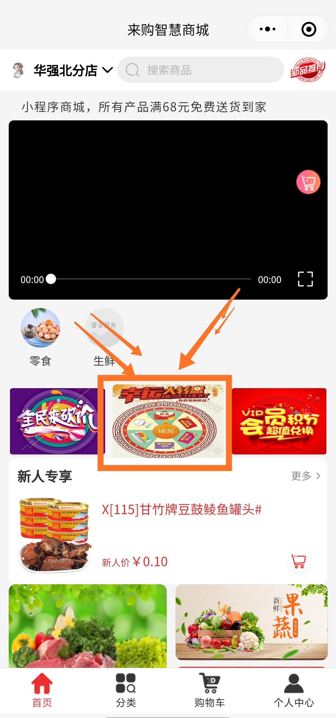 商城首頁”活動入口“展示效果:顧客進入商城后在首頁的輪播欄里可以展示活動入口