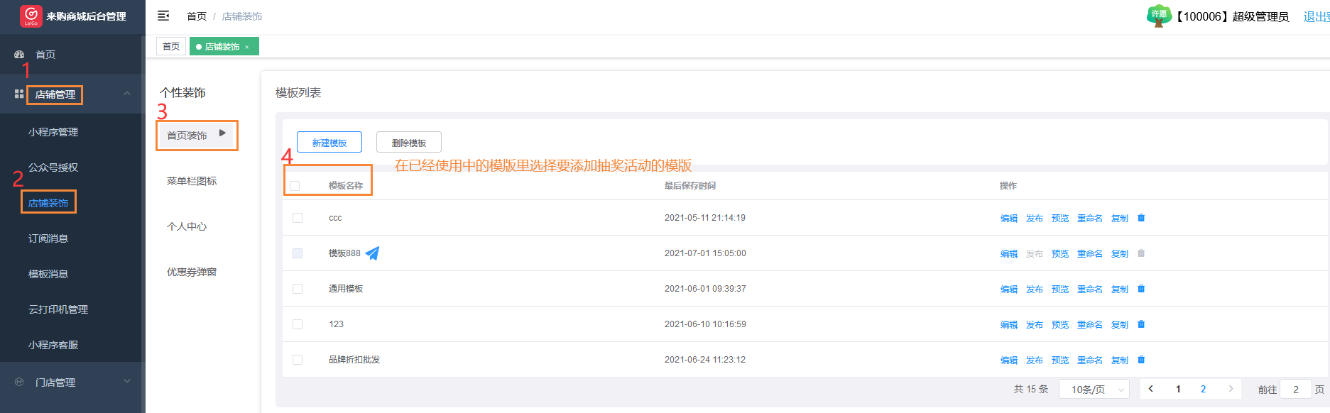 用戶進入來購商戶后臺,點開“店鋪管理”--“店鋪裝飾”--在正在使用的商城模板中選擇要添加抽獎活動入口的模版點”編輯“