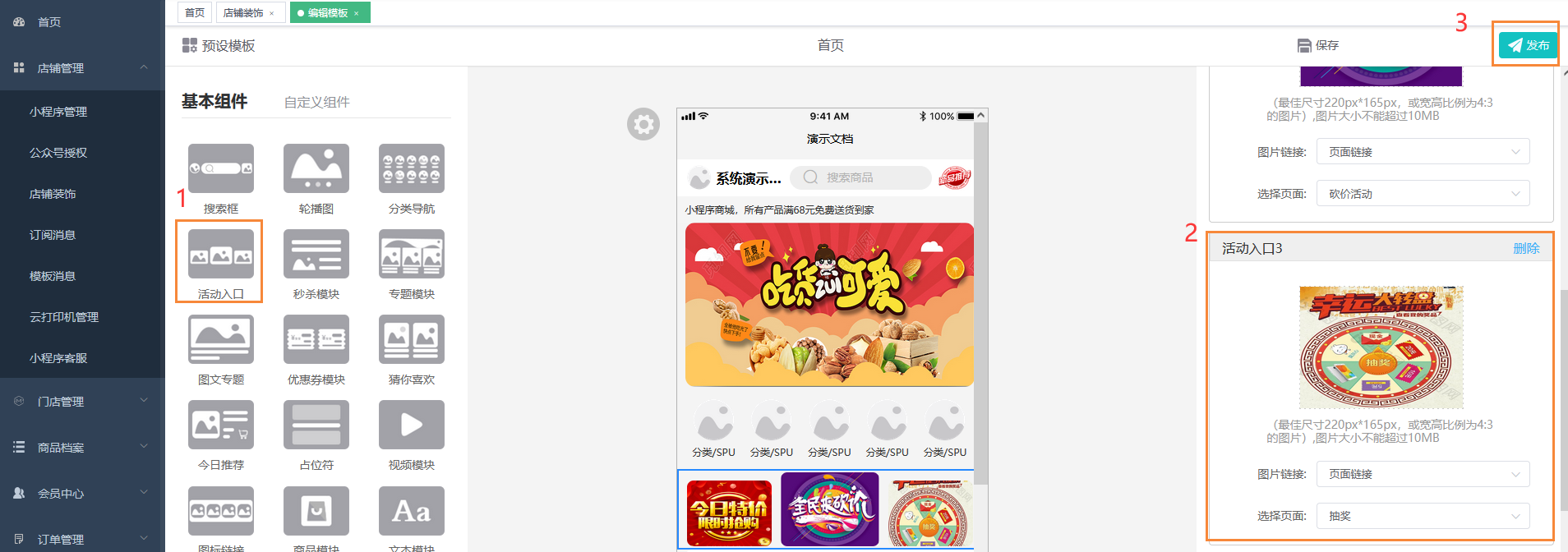 點”活動入口“--完善右邊”活動入口的信息“--點”發(fā)布“
