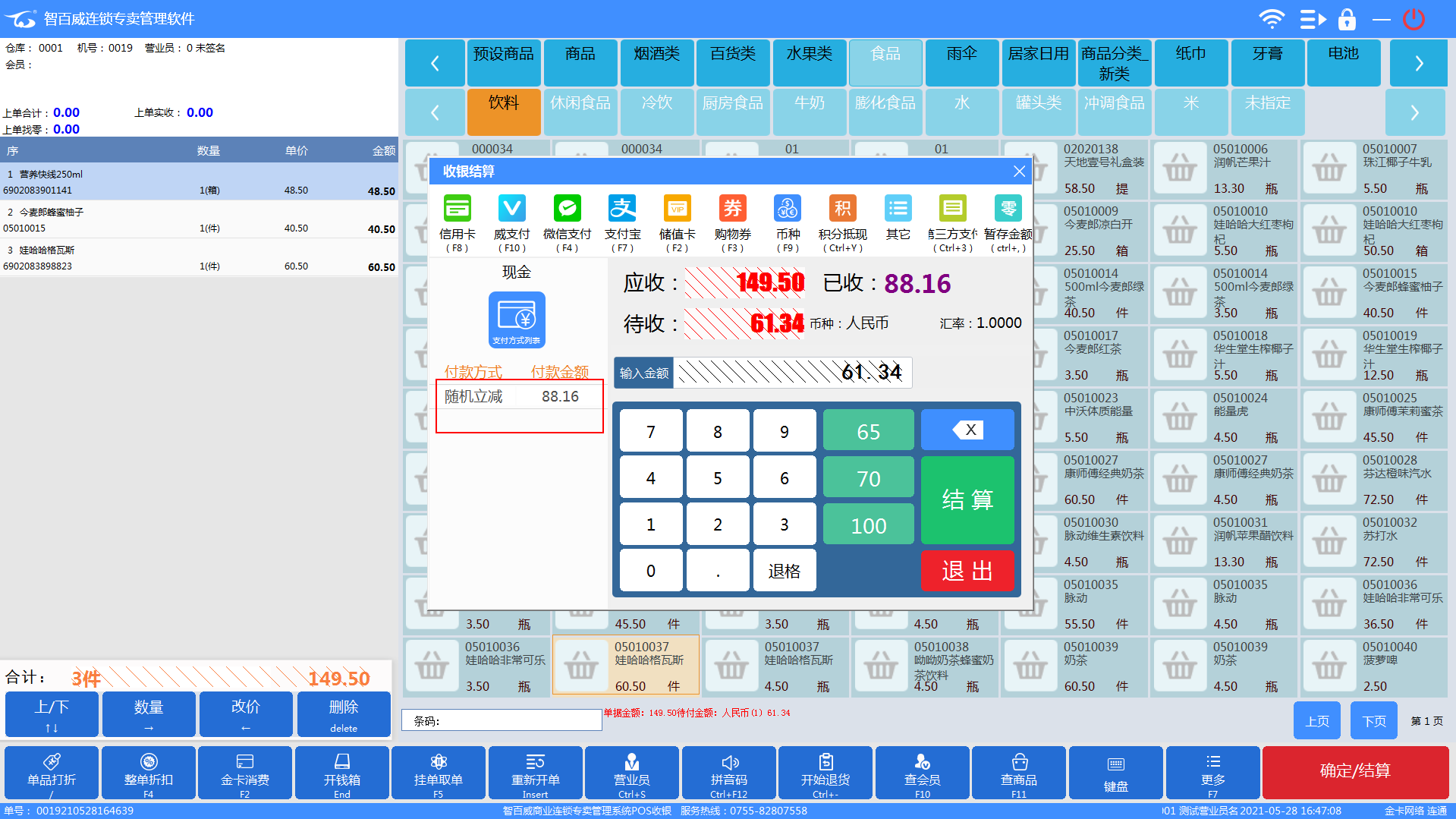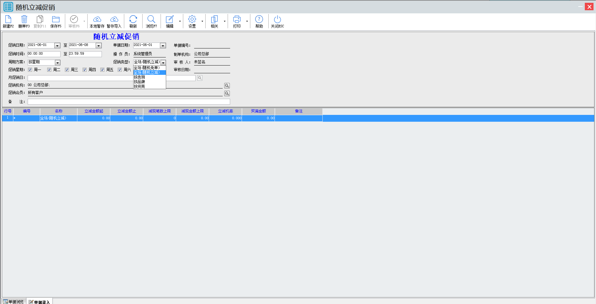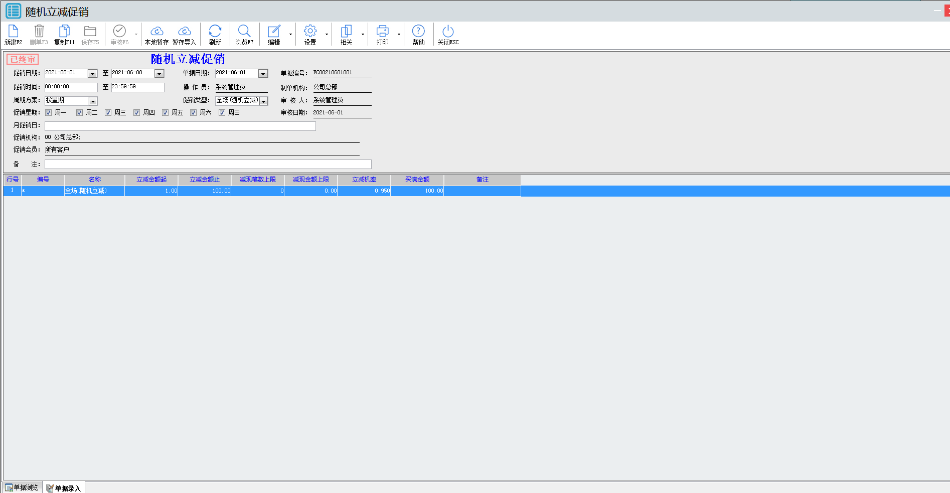 說(shuō)明:觸發(fā)了隨機(jī)立減之后,前臺(tái)不允許掛單取單/遠(yuǎn)程掛單取單,多次結(jié)算不會(huì)刷新隨機(jī)立減金額。且該促銷(xiāo)與其它促銷(xiāo)均不存在沖突,只要滿足條件均可參與隨機(jī)立減。