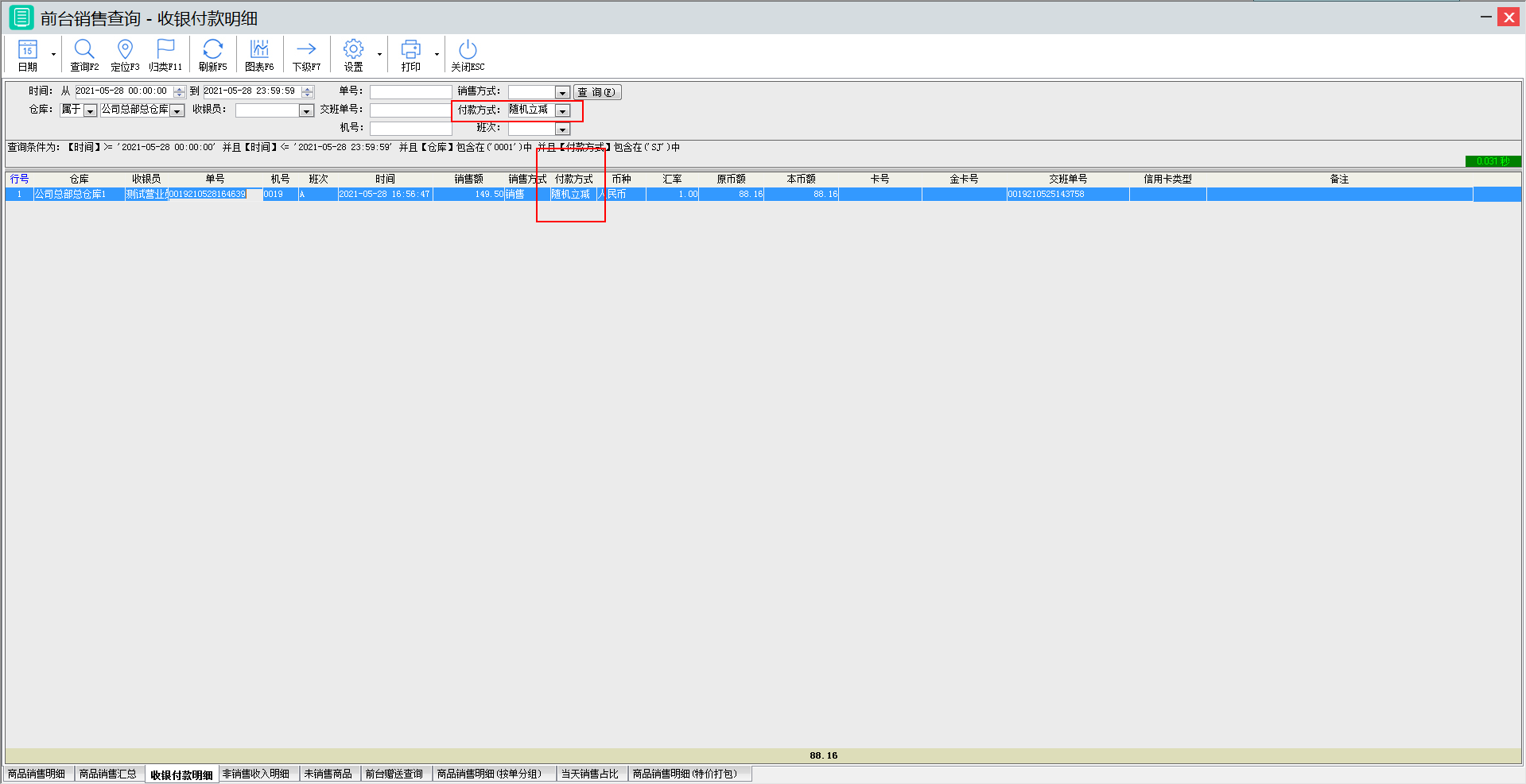 前臺(tái)收銀小票、交班小票均有打印隨機(jī)立減促銷(xiāo)的付款方式,且在后臺(tái)銷(xiāo)售收銀付款表可以查詢統(tǒng)計(jì)該促銷(xiāo)的支付金額,收銀日?qǐng)?bào)表以及交班報(bào)表等均有體現(xiàn)。