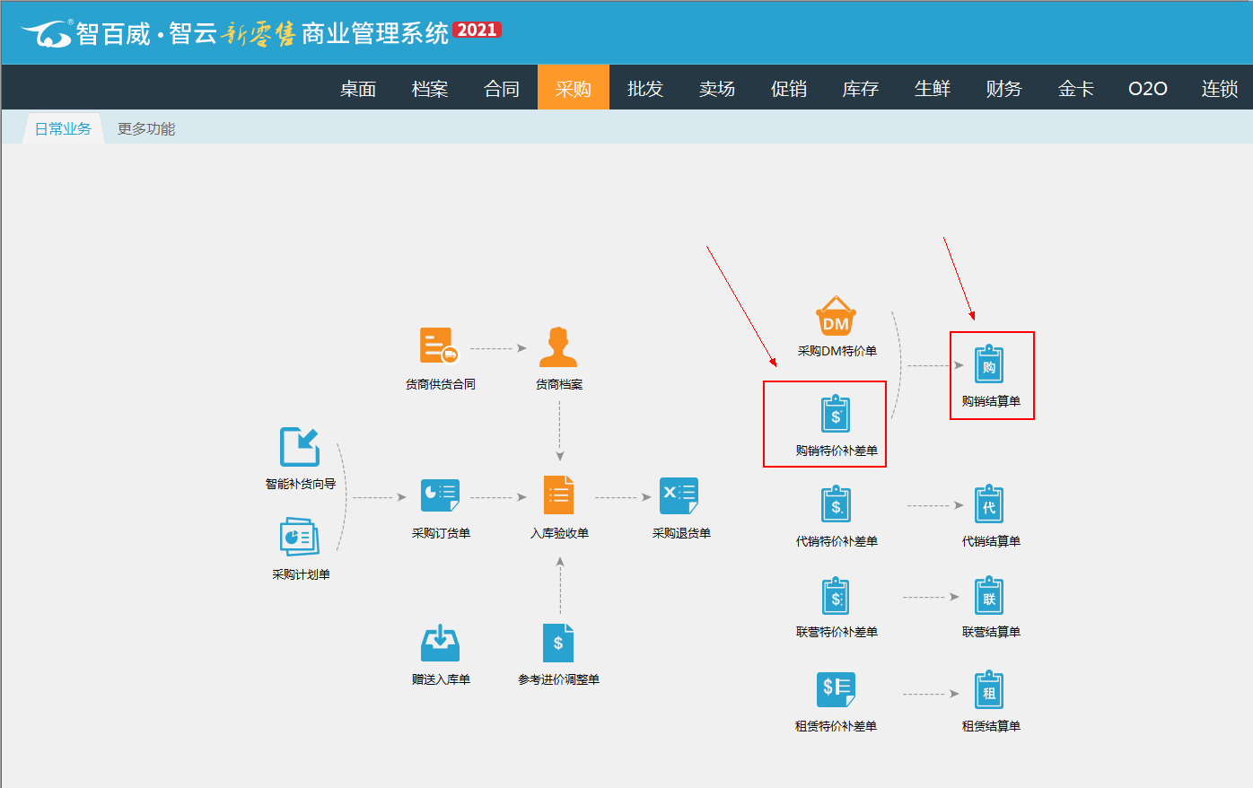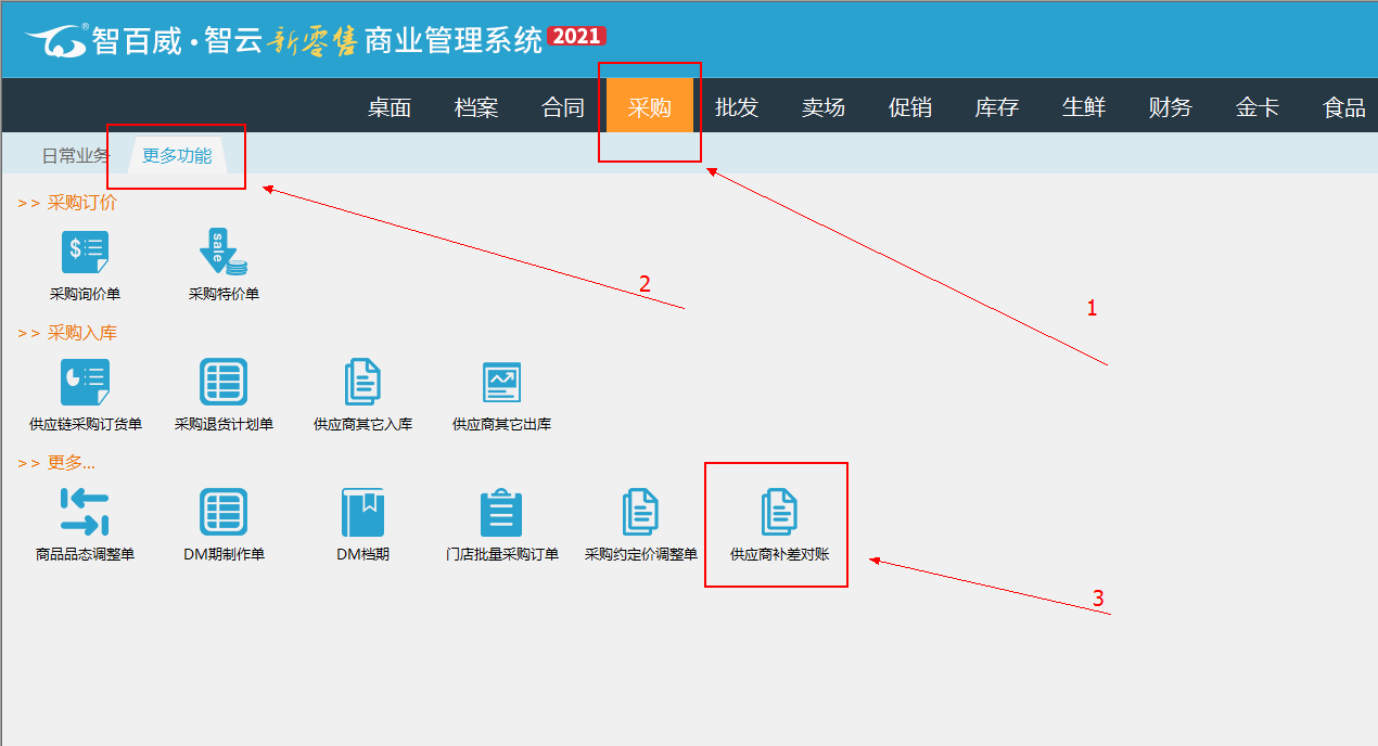 本功能目前只支持智云系統(tǒng),暫不支持其他版本,故下面以智云新零售系統(tǒng)為例進(jìn)行演示:01.該功能主要是由購(gòu)銷(xiāo)特價(jià)補(bǔ)差單生成補(bǔ)差數(shù)據(jù),均由該功能來(lái)進(jìn)行對(duì)賬,該功能在采購(gòu)模塊進(jìn)入,如下圖。