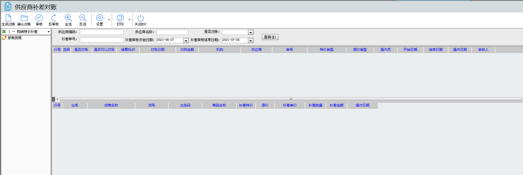 購(gòu)銷(xiāo)補(bǔ)差特價(jià)的查詢(xún)報(bào)表:補(bǔ)差的數(shù)據(jù),想要看所有的有沒(méi)有對(duì)賬的可以在購(gòu)銷(xiāo)補(bǔ)差單結(jié)果 報(bào)表的查詢(xún),如下,選擇對(duì)應(yīng)的時(shí)間、貨商、倉(cāng)庫(kù)、購(gòu)銷(xiāo)補(bǔ)差單號(hào)、是否對(duì)賬,這些查詢(xún)條件來(lái)過(guò)濾。