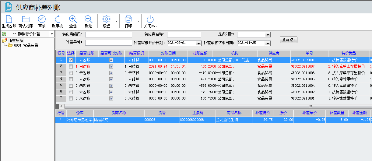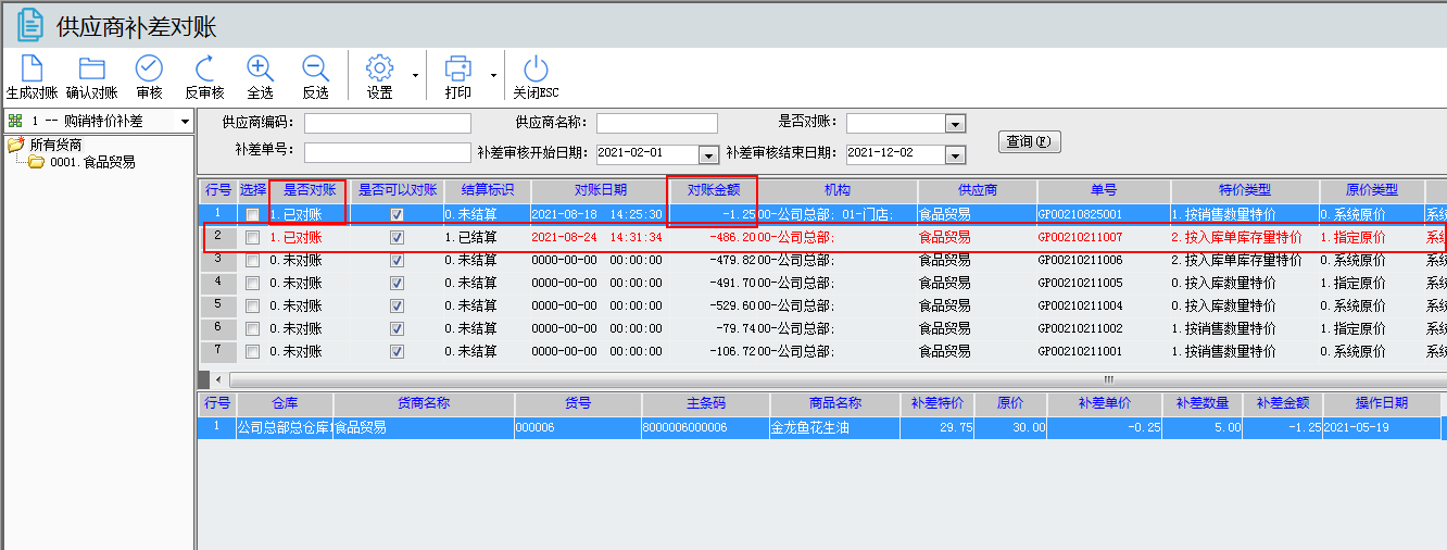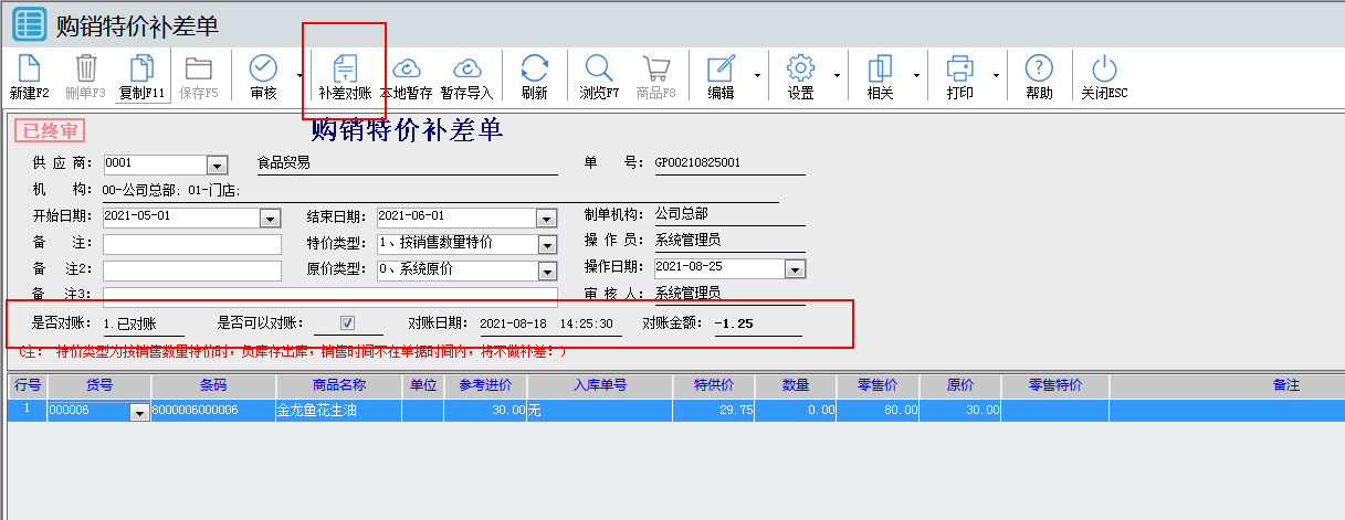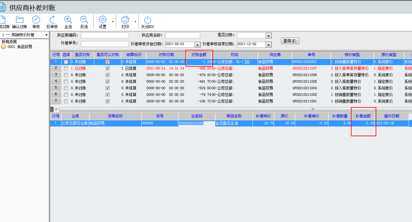 01.說(shuō)完補(bǔ)差對(duì)賬操作后,接下來(lái)說(shuō)下 購(gòu)銷(xiāo)特價(jià)補(bǔ)差單 與 購(gòu)銷(xiāo)結(jié)算單 的補(bǔ)差按鈕,先說(shuō)下購(gòu)銷(xiāo)特價(jià)補(bǔ)差單,如下界面有上是否對(duì)賬,是否可以對(duì)賬,對(duì)賬日期,對(duì)賬金額,這幾個(gè)跟補(bǔ)差對(duì)賬是一樣,做完補(bǔ)差對(duì)賬操作這幾個(gè)就會(huì)顯示具體的數(shù)據(jù)。然后就是表頭上的的補(bǔ)差對(duì)賬功能可以直接點(diǎn)進(jìn)去,直接進(jìn)入補(bǔ)差對(duì)帳功能(效果跟 本文檔第一點(diǎn)是一樣的,詳細(xì)請(qǐng)看第一點(diǎn)),如果單據(jù)是已審核,再點(diǎn)補(bǔ)差對(duì)賬,這樣跳轉(zhuǎn)過(guò)去是把本單據(jù)帶過(guò)去,顯示本單據(jù)補(bǔ)差的信息。