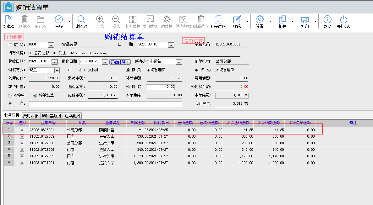 05.已審核的補(bǔ)差,補(bǔ)差對(duì)賬的結(jié)算標(biāo)識(shí)還是顯示未結(jié)算,這時(shí)來(lái)到購(gòu)銷(xiāo)結(jié)算單結(jié)算,購(gòu)銷(xiāo)結(jié)算單本次保存審核后,在補(bǔ)差對(duì)賬那結(jié)算標(biāo)識(shí)就變?yōu)橐呀Y(jié)算,原有的補(bǔ)差數(shù)據(jù)列去掉,現(xiàn)在把補(bǔ)差數(shù)據(jù)列跟業(yè)務(wù)列合并一起,如下圖