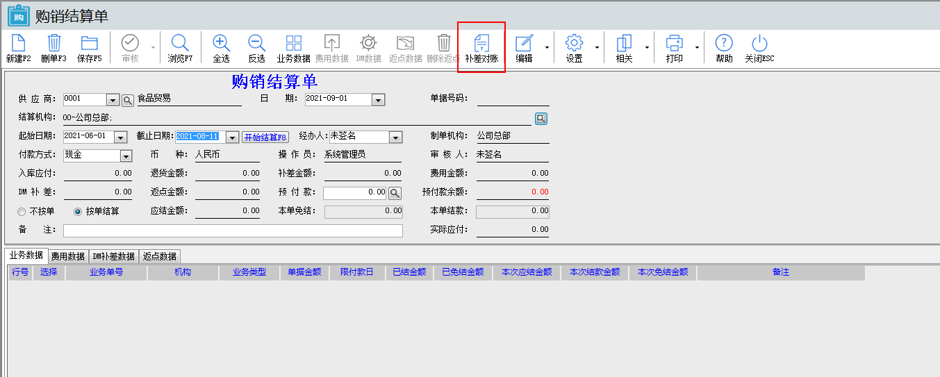 03.購(gòu)銷(xiāo)結(jié)算單在表頭上也是有個(gè) 補(bǔ)差對(duì)賬 按鈕在沒(méi)有點(diǎn)結(jié)算時(shí)(直接進(jìn)去效果跟本文檔的 第一點(diǎn)是一樣的,詳細(xì)請(qǐng)看第一點(diǎn)),選擇貨商了,時(shí)間,點(diǎn)進(jìn)去會(huì)把本單據(jù)跳轉(zhuǎn)過(guò)去,會(huì)自動(dòng)查詢(xún)?cè)撠浬淘谶@是一時(shí)間段內(nèi)的所有補(bǔ)差數(shù)據(jù)。