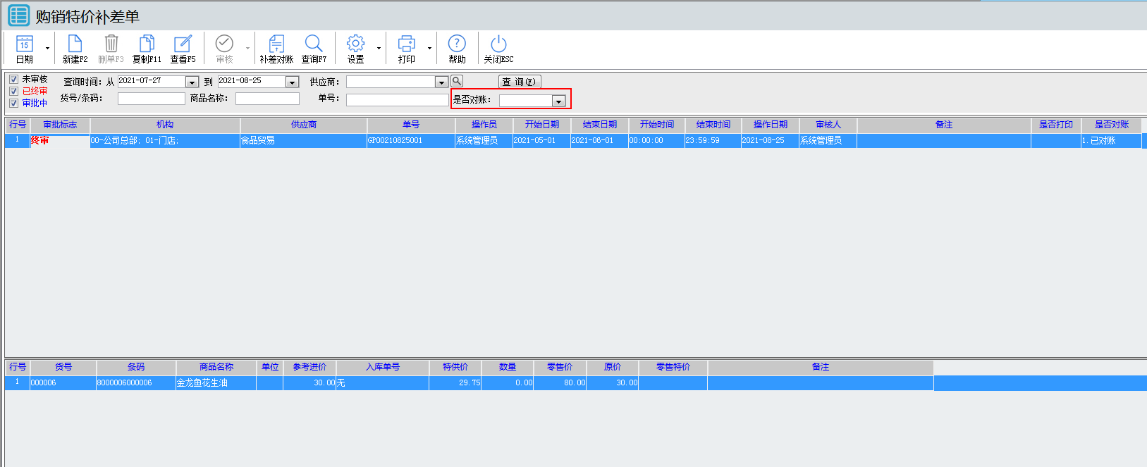 02.在單據(jù)明細(xì)增加 是否對(duì)賬 的查詢(xún)條件,如下圖,這樣可以方便查詢(xún)出哪些已對(duì)賬哪些未對(duì)帳的特價(jià)補(bǔ)差單據(jù)。