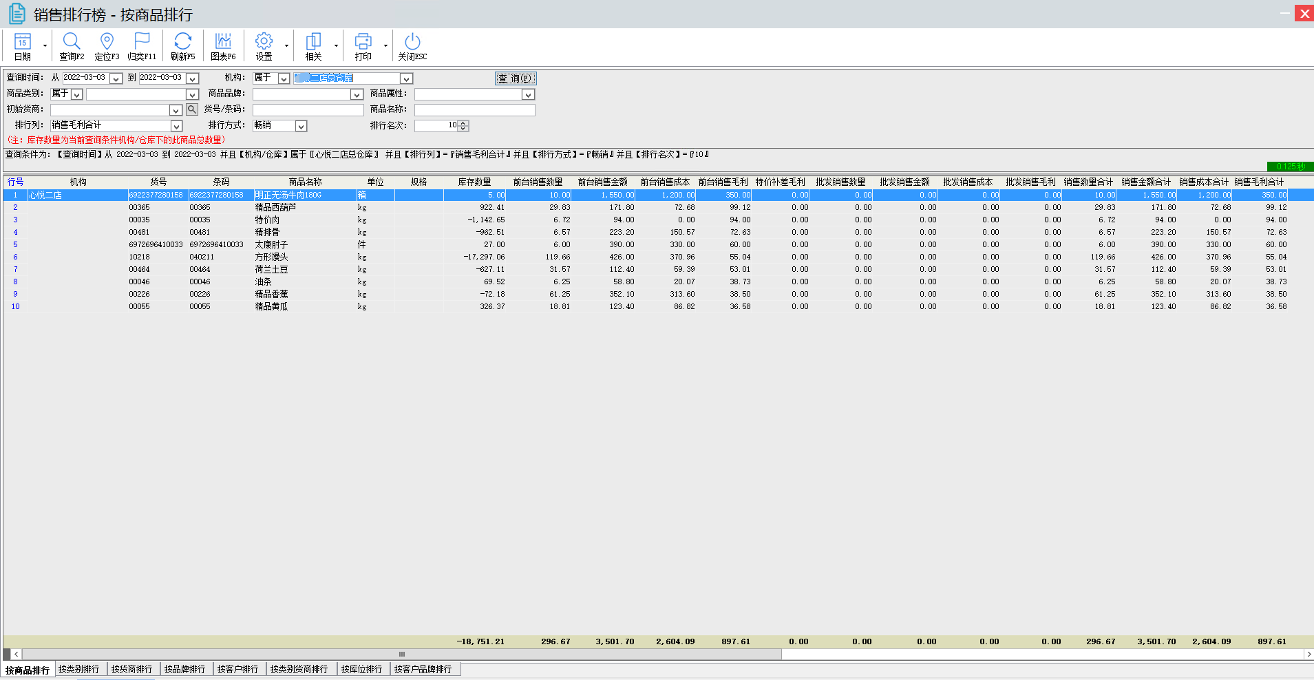 進(jìn)行銷(xiāo)售排名分析,包括按商品、類(lèi)別、貨商、品牌、客戶(hù)、類(lèi)別貨商等排行。能很好的分析出暢銷(xiāo)滯銷(xiāo)商品,毛利高與毛利低的商品。