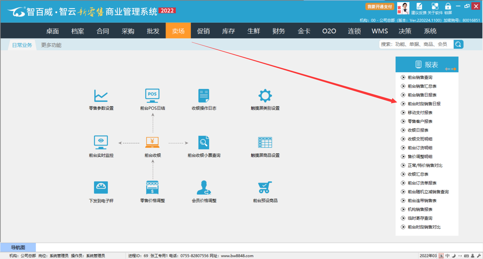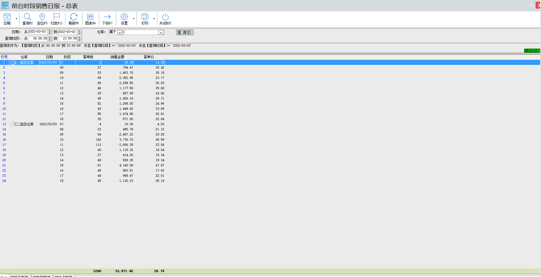 報(bào)表查詢(xún)路徑:賣(mài)場(chǎng)--前臺(tái)時(shí)段銷(xiāo)售日?qǐng)?bào)