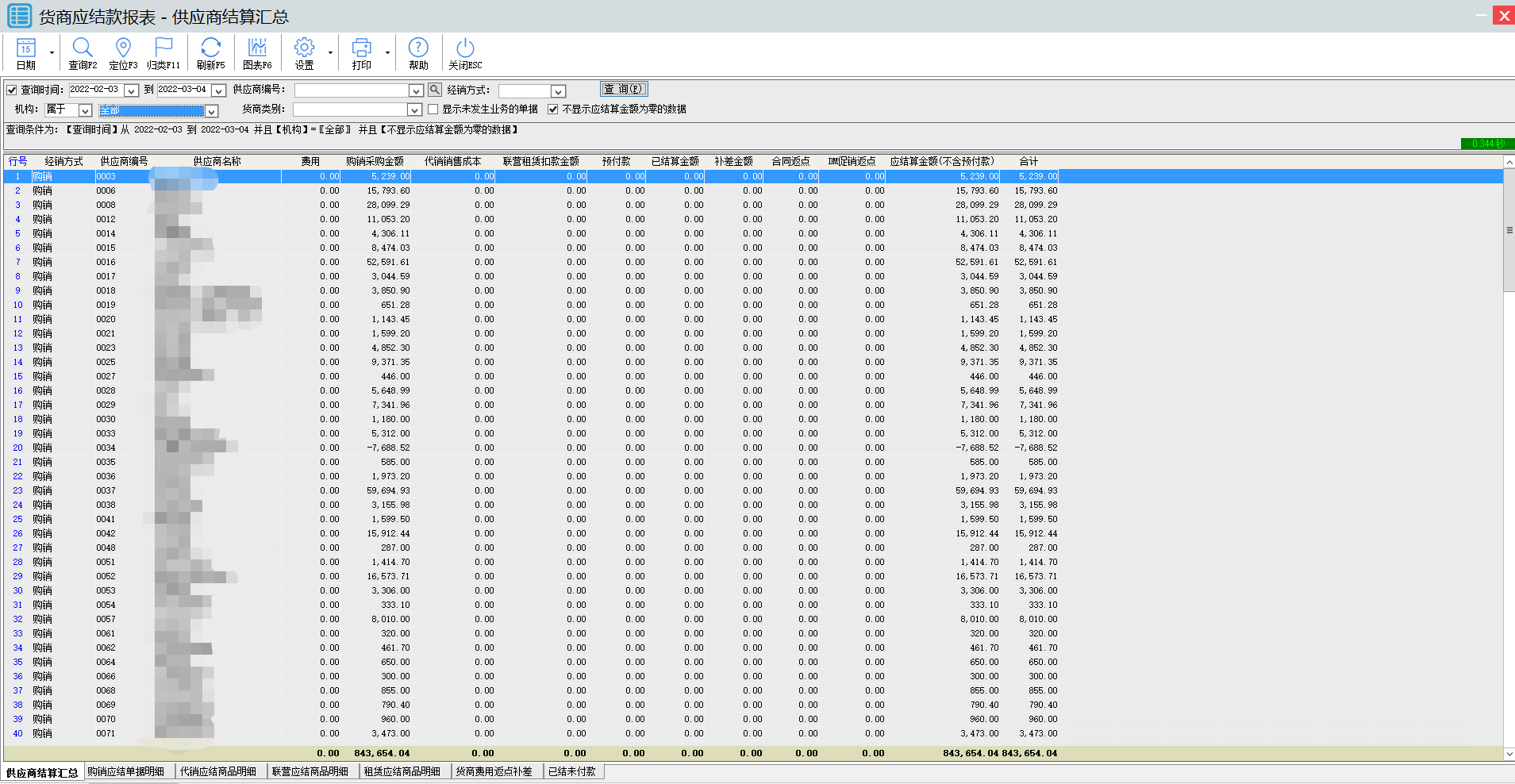 查詢(xún)所有供應(yīng)商應(yīng)結(jié)帳款的匯總,包括應(yīng)結(jié)款匯總、購(gòu)銷(xiāo)應(yīng)結(jié)款、代銷(xiāo)應(yīng)結(jié)款、聯(lián)營(yíng)應(yīng)結(jié)款、貨商費(fèi)用、返點(diǎn)費(fèi)用。