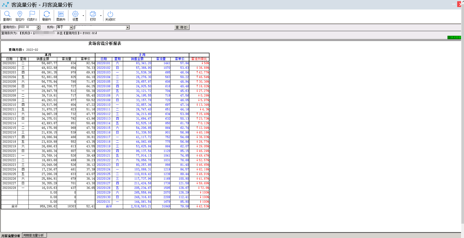 可以分別顯示出本月和上月同一時(shí)間的客流量,客單價(jià),升降比。