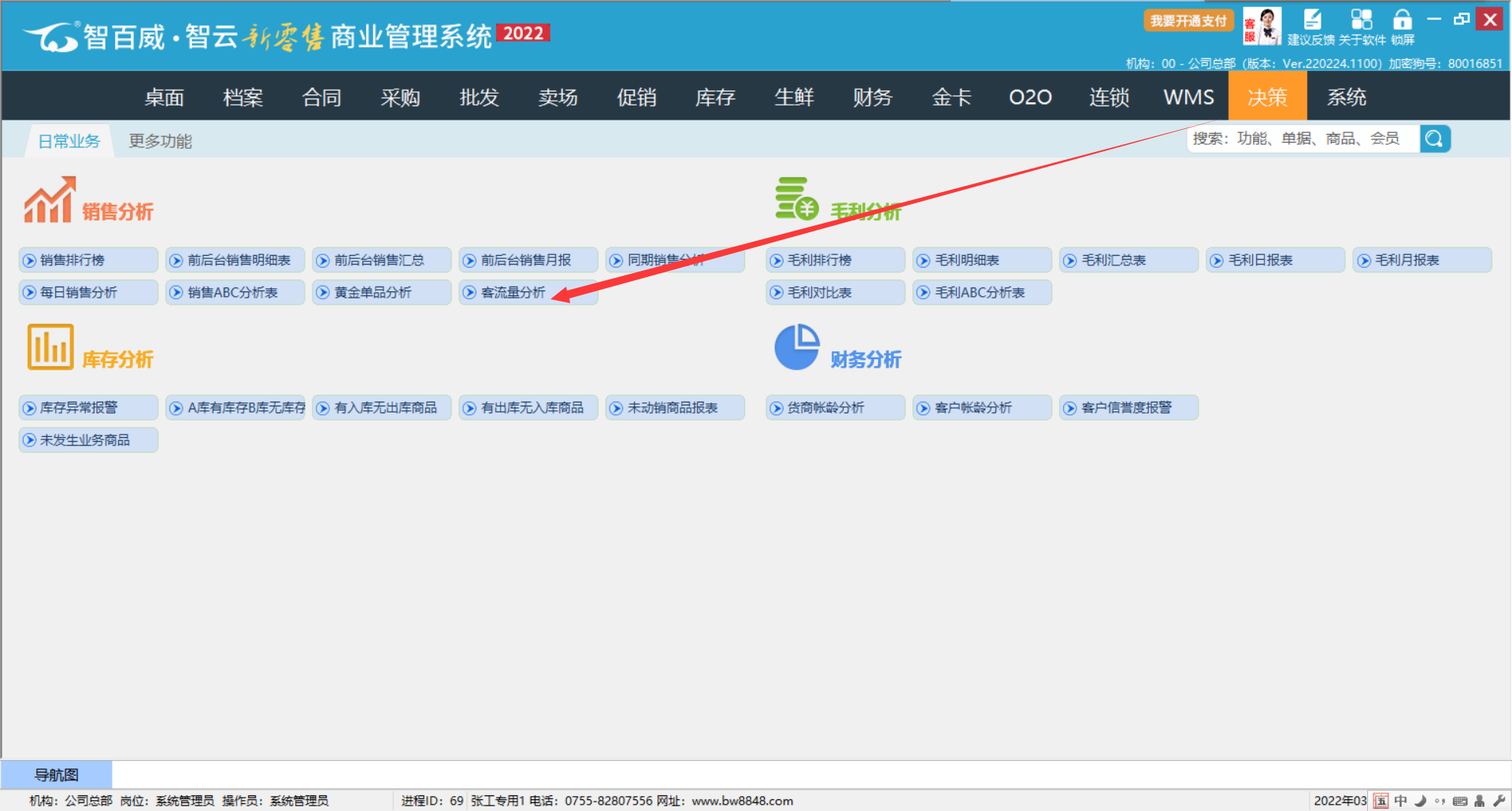 報(bào)表查詢(xún)路徑:決策--銷(xiāo)售分析--客流量分析