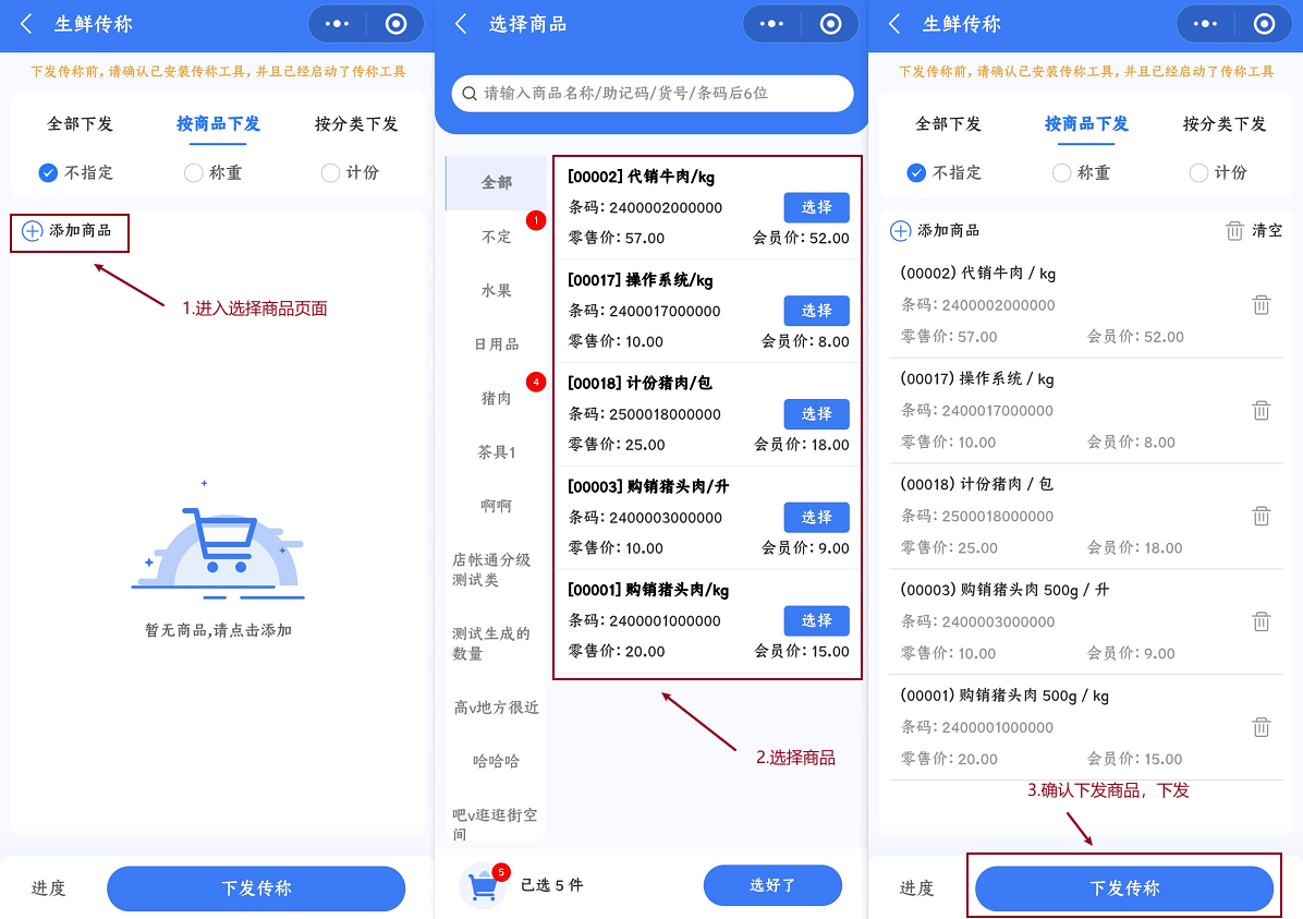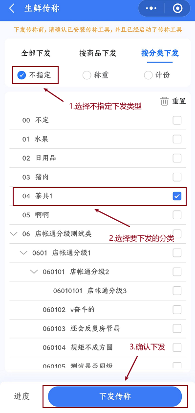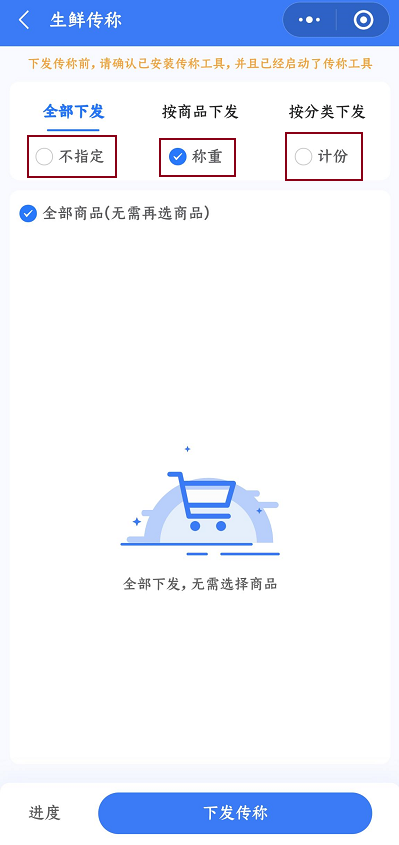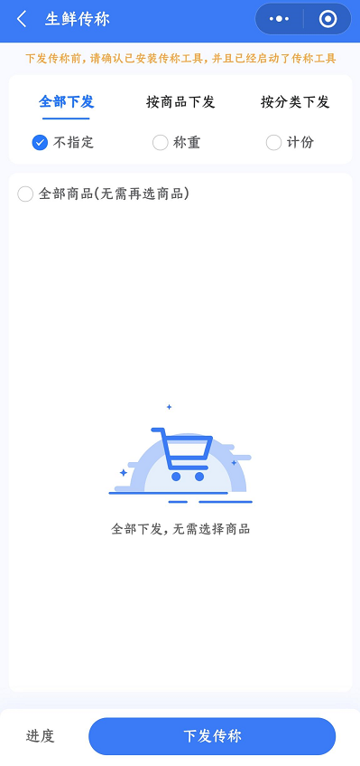 生鮮傳秤有:全部下發(fā)功能、按商品下發(fā)功能、按分類(lèi)下發(fā)功能和進(jìn)度查詢(xún)功能